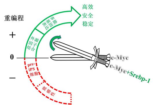 2006年,日本科学家Yamanaka成功利用四个转录因子Oct4、Sox2、Klf4和c-Myc将小鼠胚胎成纤维细胞诱导成了多能性干细胞(iPSC)。其中,原癌基因c-Myc是重编程体系中的双刃剑。一方面,c-Myc能调控一系列生理过程包括细胞周期、细胞增殖、代谢转换、信号转导以及多能性基因的表达等从而极大促进体细胞重编程。在重编程过程中,它还能招募组蛋白乙酰转移酶以及促进其它重编程因子对染色质的结合。但是,另一方面,c-Myc同时也会导致许多不完全重编程细胞的形成(pre-iPS细胞半成品),而且有极大的致癌风险。这为iPS细胞的应用带来了极大的低效障碍和安全风险。