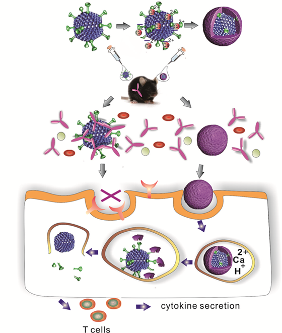 为克服体内腺病毒中和抗体的这种负面影响,该团队科技人员创造性地将自然界中广泛存在的生物矿化(biomineralization)现象应用于修饰和提升疫苗的性能。以携带艾滋病抗原的腺病毒载体疫苗为模型,研究人员发现磷酸钙盐在一定条件下可在腺病毒表面形成一层矿化薄膜,犹如给病毒添加了一层“蛋壳”(Shell)。经过一系列体内外实验表明,BVSE技术可有效避免腺病毒载体疫苗被中和抗体识别,并高效感染靶细胞并促进其携带的HIV的抗原基因的表达。同时还发现经BVSE处理的疫苗表面携带的Ca2+离子兼有佐剂的功能,更有利于疫苗发挥更大潜能,激发出更有效的HIV病毒特异性的多功能性细胞免疫应答,显著地提高了HIV疫苗的免疫效果。本研究为提升腺病毒载体的使用效率和使用范围提出了一种崭新思路,对研发更有效地针对艾滋病、其它传染性疾病和肿瘤的疫苗及免疫治疗新策略具有重要科学意义和应用价值。
