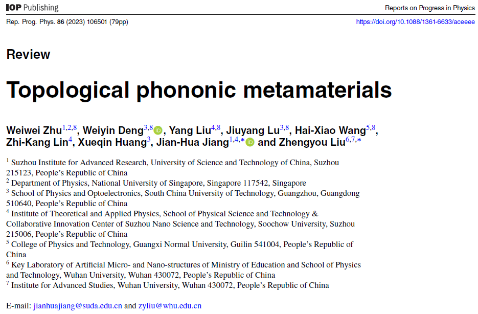 蒋建华教授团队在Reports on Progress in Physics(IF=20.7)的综述论文“拓扑声子超材料”(Topological phononic metamaterials)入选IOP Publishing前1%高被引论文。这篇综述是以中国科学技术大学苏州高等研究院为第一完成单位,联合武汉大学、华南理工大学、苏州大学及广西师范大学等多所高校的科研团队共同完成,通讯作者为我院蒋建华教授和武汉大学刘正猷教授。