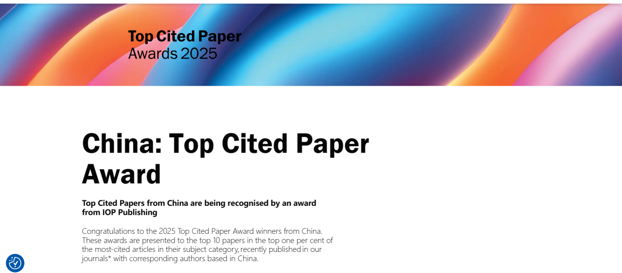 近期,英国物理学会出版社(IOP Publishing)公布了2025年“中国高被引文章奖”获奖名单,以表彰中国研究人员在全球科学界的影响力以及他们对物理学的宝贵贡献。