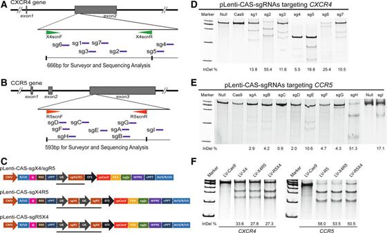 CD4+T细胞是HIV-1感染人体的主要靶细胞,也是艾滋病基因治疗的重要功能性细胞。CCR5是HIV-1感染CD4+T细胞的主要共受体。随着病毒感染的推进,病毒嗜性从R5-嗜性向X4-嗜性转变,并最终导致患者进展到AIDS期。因此,对于慢性期HIV-1感染者,同时敲除CXCR4和CCR5将可能阻断任何单一嗜性和双嗜性病毒的侵袭,从而提供双重保护,实现艾滋病的功能性治愈。