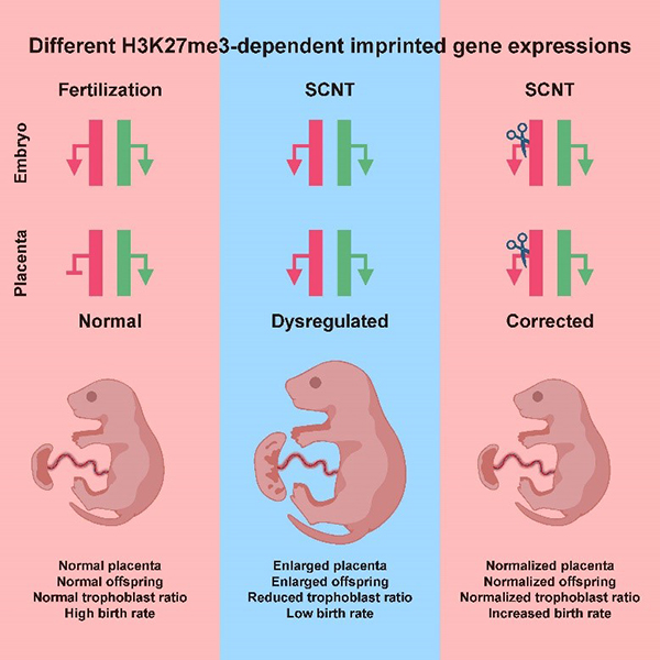2017年,利用人工构建的孤雌和孤雄胚胎和早期胚胎测序技术,哈佛大学张毅实验室发现了H3K27me3控制的印记(亲本特异性单等位表达)蛋白编码基因,其中四个(Sfmbt2,Gab1,Smoc1,Jade1)在胎盘中受H3K27me3印记,在胎儿中不印记(双等位表达)2。核移植重编程无法修正印记的缺陷。例如,对原始生殖细胞(不具备完整印记)进行克隆,无法获得具备完整印记的胚胎,也无法得到动物。一般认为,只有“印记正常”的供体细胞才能够被成功克隆。与很多情况下一样,对基础知识的更新挑战了“一般认知”:既然体细胞没有H3K27me3印记,也许所有的克隆胎盘都是“印记异常”的?这些异常对克隆胎盘的缺陷有什么贡献?