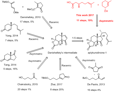 Aplykurodinone-1源于降解的海洋甾体,于2005年在Syphonota geographica海洋软体动物中分离得到。由于潜在的生物活性及其复杂的结构特征,它引起了大量合成研究人员的研究兴趣。截止目前,共有六个课题组报道了相关的研究工作。他们的策略各有特色,但都包含了Danishefsky路线中的关键中间体,导致手性控制不好,总产率偏低,合成效率不太理想。