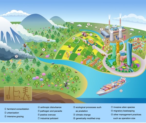 图2. 我国蜜蜂面临的主要生态威胁因素图示。秦天怡绘制。