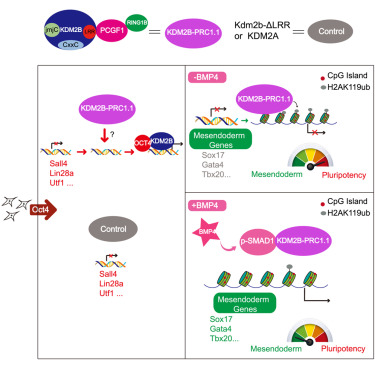 陈捷凯博士等人在2011年曾报道BMP信号可以显著促进Oct4单因子诱导的iPS细胞形成,因此在该研究中,研究人员希望结合BMP信号和KDM2B来获得更高效的Oct4单因子重编程,出乎意料的是,两者同时使用时,重编程效率比单独加其中任何一者都要更低,这提示BMP信号会对KDM2B-PRC1进行调节。研究人员使用KDM2A和KDM2B-ΔLRR作为对照,证明PRC1的招募能力是出现这一抑制因素的原因。进一步的ChIP-seq实验表明,加入BMP后,KDM2B、H2AK119泛素化在CGI区的水平出现了显著的下降,后续研究表明,BMP下游的Smad1蛋白可以与KDM2B相互作用,并导致KDM2B在染色质上的结合能力下降。这种KDM2B-PRC1的结合削弱会导致显著的中内胚层基因表达,从而改变了细胞的命运走向。