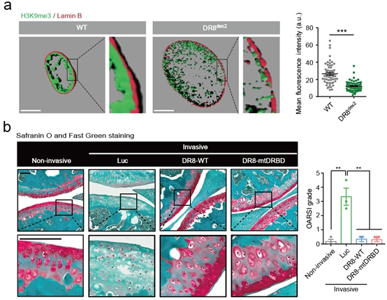 图(a)DGCR8参与异染色质结构维持,(b)基于DGCR8过表达的骨关节炎基因治疗。