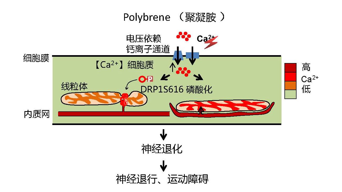 刘兴国课题组通过体内外模型研究了低剂量polybrene对神经系统的毒性。在体内方面,侧脑室注射polybrene造成小鼠行为学(运动障碍)和病理学(神经死亡和胶质增生)上的神经退行表型。在体外方面,polybrene会导致人诱导多能干细胞(iPSCs)分化来源的神经元出现退化。进一步发现polybrene激活VDCC门控的胞外钙内流,导致了神经元胞内钙浓度的异常升高;升高的胞内钙双向调控两种细胞器异常重塑:DRP1S616位磷酸化介导的线粒体断裂和代谢异常,内质网片段化并和线粒体耦合介导线粒体钙超载,从而启动神经退化。