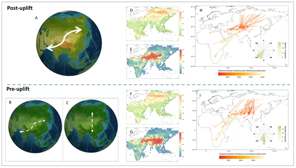 青藏高原隆升是地球历史上最重要的地质事件之一,不仅塑造了亚洲大陆的地形格局,也深刻影响了区域气候与生态系统的演化。高原的抬升改变了大气环流,形成了广泛的亚洲季风系统,从而重塑了生物的分布格局和迁徙路线。鸟类是全球气候与生态变化最敏感的指示物之一,其迁徙行为反映了对环境因素的长期适应。然而,青藏高原隆升如何通过改变气候动力学过程影响动物迁徙方向,一直缺乏系统性的研究。
