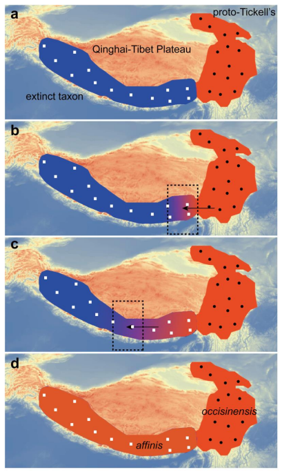 线粒体基因由于具有比核基因更快的突变率,使其能有效应用于近期分化物种的系统发育研究和估算物种分化时间。然而在某些特殊情况下,单个群体内或者两个近期分化的物种之间,会出现多个深度分化的线粒体支系,这种现象我们称为深度的线粒体分化(DMD,deep mitochondrial divergence),表示两个种群之间在核基因组不分化或者分化不明显的情况下具有非常深的线粒体分化,而不同的线粒体支系之间同时还伴随着显著的核基因流。我们以黄腹柳莺(Phylloscopus affinis)种组为研究对象,通过基因组序列和多个表型数据(鸣声、羽色和形态测量)的比较分析,发现分布于喜马拉雅地区的黄腹柳莺(P. affinis)和分布于青藏高原东部的华西柳莺(P. occisinensis)之间的核基因和表型均无显著分化,但其线粒体分歧时间达到了3个百万年(图1),是一种典型的DMD现象。另外,基于对种群动态、连锁不平衡和基因组分化高峰区的分析,本研究推测在青藏高原东部分布的祖先种群(proto-Tickell’s)向西扩张并替代了当时分布于该区域但目前已灭绝的另一物种(图2),而灭绝物种的线粒体以及少量核基因片段通过遗传渐渗传递到了该扩张种群,形成了目前的黄腹柳莺。而此灭绝的物种则被称为“幽灵种”,与幽灵种之间的基因渗透现象则被称为“幽灵渗透”。