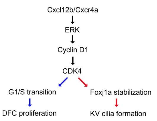 综上所述,趋化因子Cxcl12b/Cxcr4a信号通路通过激活ERK1/2活性,调控下游基因Cyclin D1表达。Cyclin D1-CDK4/6复合体一方面促进细胞增殖,另一方面磷酸化转录因子Foxj1a,增强其蛋白稳定性,促进细胞纤毛生成(图3)。该研究不仅揭示了胚胎左右不对称发育中细胞周期进程与纤毛形成之间关联的分子机制,而且提示在胚胎的原肠期,背部先驱者细胞的增殖不仅为KV结构的建立提供了足够数目的细胞,更是为下一阶段KV细胞纤毛生成储存了足够多的Foxj1a蛋白。