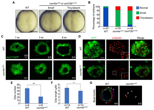 图2.Cxcr4a突变体KV较小,细胞纤毛变短,KV液流停滞