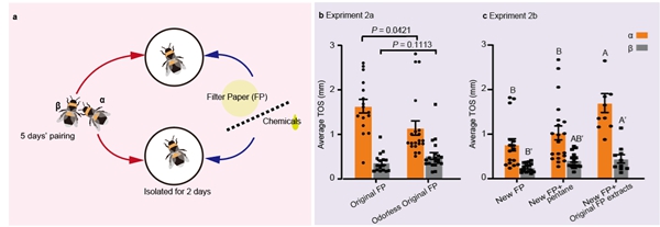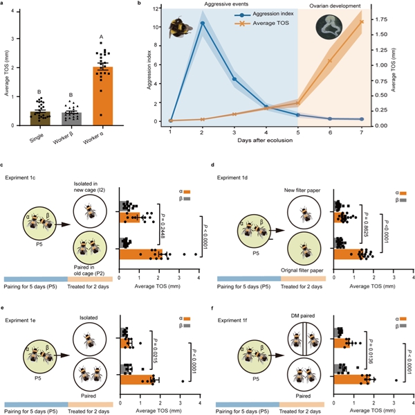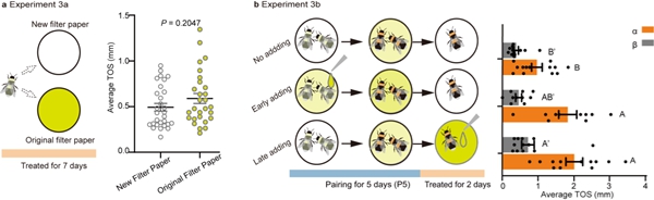 研究者在单独饲养的工蜂中回补这类化合物,发现仅凭化学信号并不能激发其生殖。进一步在打斗行为发生前后分别添加信息素回补,结果显示两种时序均能诱导工蜂生殖,说明信息素的感知时机与打斗行为的发生顺序并不固定,二者协同作用才是关键。