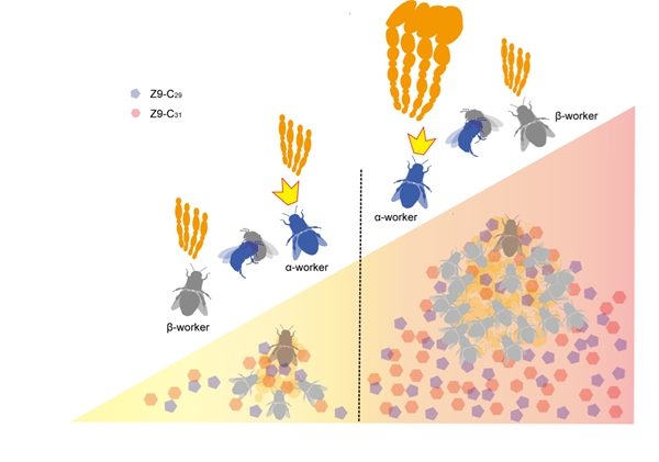 这项研究不仅揭示了工蜂通过自组织方式调控生殖的“群体智慧”,更是首次发现可诱导工蜂卵巢发育的信息素,提出了“群体感应信息素模型”在社会性昆虫生殖调控中的新机制,为理解社会性演化提供了全新视角。