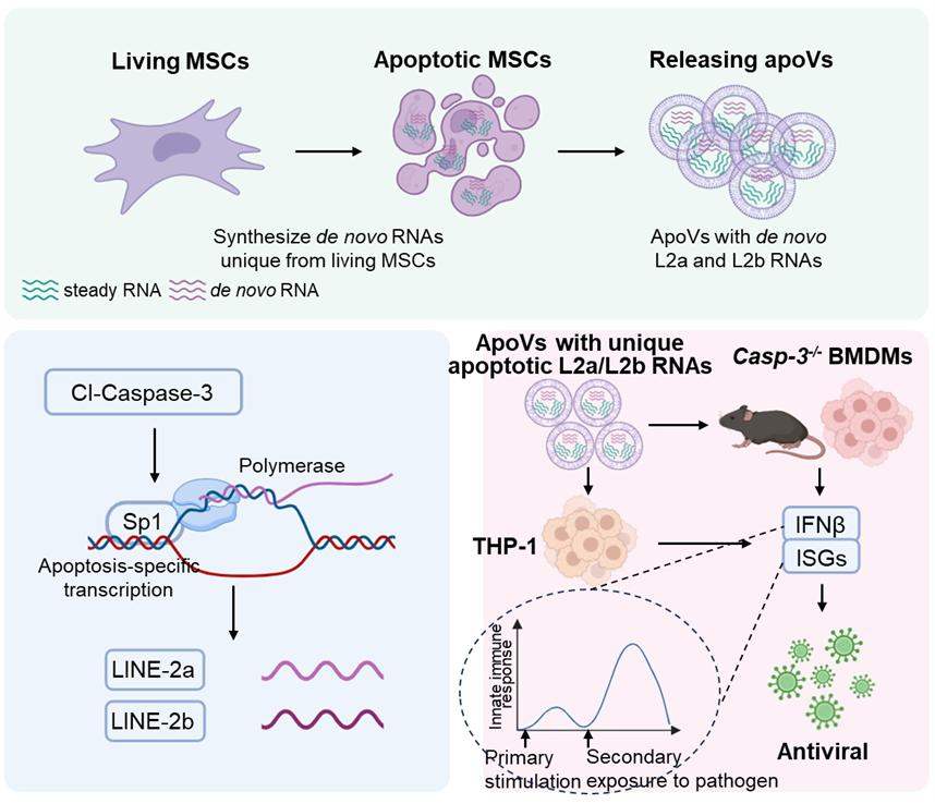 该研究首次揭示了凋亡细胞及其代谢产物——凋亡囊泡(apoVs),在程序性死亡过程中主动合成多种RNA的全新现象。通过5-乙炔基尿苷(EU)代谢标记与点击化学反应技术,应用新生RNA测序(nascent RNA-seq),系统绘制了凋亡间充质干细胞(MSCs)及其凋亡囊泡(apoVs)的新生转录本图谱。研究发现,凋亡细胞与apoVs从头合成大量与活细胞不同的新生RNA,包括长散在核元件(LINE)L2a/L2b RNA。凋亡细胞合成RNA依赖于caspase-3/Sp1/RNA聚合酶的信号轴,而凋亡代谢产物apoVs则携带来自凋亡细胞的独特L2a/L2b RNA,具有抵御病毒感染的生物学功能。