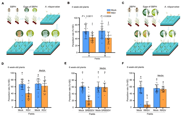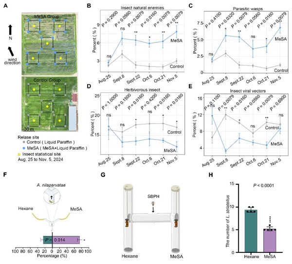 研究团队发现,健康水稻在遭受媒介昆虫侵害时,会释放一种关键挥发物——水杨酸甲酯(MeSA)。这种“植物警报信号”既能驱避灰飞虱等害虫,又能精准吸引寄生蜂等天敌寄生灰飞虱等害虫虫卵,通过自然捕食这一间接防御实现害虫种群调控,是作物自带的生态防御系统。