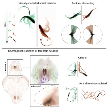 社交参与不足可诊断多种神经发育障碍,包括自闭症和精神分裂症。像斑马鱼这样的遗传易处理动物模型可以对这些社会障碍背后的发展因素提供宝贵见解,但是这种方法的前提是能够准确,可靠地量化细微的行为变化。同样,表征局部分子和形态表型需要了解社会行为的神经解剖学相关性。我们利用斑马鱼中的行为和遗传工具来加深我们对社会行为的了解,并确定对推动其行为的重要大脑区域。我们描述了成年斑马鱼对之间的视觉社会互动,并发现他们表现出一种刻板的定向行为,反映出社会的关注。此外,在成对的鱼中,一个个体的定向行为是驱动另一个个体相同行为的主要因素。我们使用人工和遗传损伤来研究前脑对这种行为的贡献,并确定了腹侧端脑中的神经元群,其消融抑制了社会互动,同时保留了其他运动和视觉行为。这些神经元是胆碱能的,并表达编码小鼠前脑胆碱能神经元所需的转录因子Lhx8a的基因。斑马鱼中鉴定出的神经元种群位于与哺乳动物前脑区域同源的区域,该区域涉及社会行为。我们的数据表明,进化上保守的神经元群体控制了斑马鱼的社会定向。斑马鱼的社会互动:成年斑马鱼在野外和实验室都有很强的聚集和学习的动机。由于斑马鱼具有这种天生的社交能力,因此它越来越成为了解影响社会行为的潜在遗传和发育机制的流行模式。当斑马鱼成对居住时,它们表现出类似于平行游动和转向伴侣的行为。众所周知,斑马鱼会根据社会刺激的参数(如数量、位置和速度)来改变它们的行为,这些社会互动在多大程度上是由同一特定刺激的行为所驱动的,这还不清楚。现有指标(例如距特定对象的距离)可能对社交互动的更细微部分的中断(例如行为刺激的重要性)不敏感。为了解决这个缺点,我们设计了一个严格的视觉测试来诱导社会行为,它由一个单独的容器和一块电致变色膜组成,,电致变色膜可以从不透明变为透明。我们在成年鱼身上发现了一种刻板的定向模式,类似于先前在幼鱼身上描述的行为,这种现象发生在个体鱼受到社会刺激时出现,即邻近鱼缸中的鱼。我们发现,在这些鱼群中,当可见社会刺激时,相对于电致变色膜分隔器的方向在45°至90°之间的方向瞬时增加,在5分钟内恢复到原状。这些结果表明,斑马鱼通过定向体轴与特定物种相互作用,并且在我们的分析中它们习惯于社交刺激。先前的研究表明,这种行为可以反映斑马鱼的社会关注度,从而支持了我们实验中定向的相关性。同样,定向指标与到分隔线的平均距离高度相关,分隔线是其他鱼类社交互动研究中常用的社交偏好度量。为了确定这种行为是否明确地是社会性的并且是由特定物种驱动的,我们使用一个空缸或一个新物体进行了相同的实验,发现定向行为没有类似的瞬时增加。当斑马鱼暴露在空的鱼缸刺激下时,即使在没有定向的情况下,斑马鱼对靠近分隔器的鱼缸侧的偏好在统计学上也显著增加,因此对两个透明的鱼缸侧的偏好是相等的。这些结果表明,在没有社会刺激的情况下,斑马鱼接近分隔线时,定向行为需要两条鱼之间的相互作用。 我们得出的结论是,与分隔线之间的夹角为45°至90°,这是对社交互动的严格衡量,它可能反映出自然环境中的平行游泳和定向行为。我们在两种野生型实验室品系(ABxTU和WIK)中测试了雌雄配对,发现它们对社会刺激的反应相似,这表明斑马鱼菌株之间存在社会定向现象。我们还发现品系之间运动时间百分比没有差异。通过测量45°到90°之间的时间,我们可以确定两种性别鱼之间的细微差异,表明无论刺激鱼的性别如何,接受测试的雌性鱼都比雄性鱼参与社会定向的可能性低。这些发现重复了先前对斑马鱼社会行为性别差异的描述。在运动时间的百分比上没有性别差异,这表明性别差异是特定于社交活动的。为了确定定向测定法是否足够灵敏以检测出行为受损,我们用阿扑吗啡(APO)(一种已知会损害小鼠社交互动的广泛的多巴胺受体激动剂)对斑马鱼进行了处理。与哺乳动物的研究一致,经APO处理的鱼接触刺激鱼,并且在暴露于刺激鱼的情况下,在45°–90°下花费的时间没有显著增加。我们观察到APO处理的鱼在运动中所花费的时间百分比受到抑制,但这种影响在统计学上并不显著。这种效应在5分钟的记录期内持续存在,这表明伴侣的积极社会参与对于鱼类展示社会定向行为是必要的。我们研究了是否减少了社会参与,因为经APO处理的鱼将更多的时间花在远离分隔线的地方。我们将APO处理过的鱼放在一个缩短的鱼缸中,这个鱼缸限制了它们离开分隔线的运动,并且发现经APO处理过的试验鱼在刺激下的相对于对照鱼仍然抑制了社会定向。从这些结果中我们得出结论,另一条社会参与的鱼是进行社会定向所需的刺激,仅存在没有社会参与的鱼是不够的,无论它们的接近程度如何。我们进一步研究了行为同刺激鱼与分隔物的距离在驱动社会定位中的作用。试验鱼的方向和刺激鱼的距离高度相关,刺激鱼的定向行为也是如此。然而,多元线性回归表明,当刺激鱼的取向和距离都被考虑作为预测变量时,只有定向行为显著地反映了试验鱼的变异性,这表明刺激鱼的接近程度比其定向的影响小。在刺激之前的测试鱼和刺激鱼之间还没有这样的关系。我们得出结论,刺激鱼的定向行为而不是接近性是驱动测试鱼定向行为的原因。我们研究了鱼类之