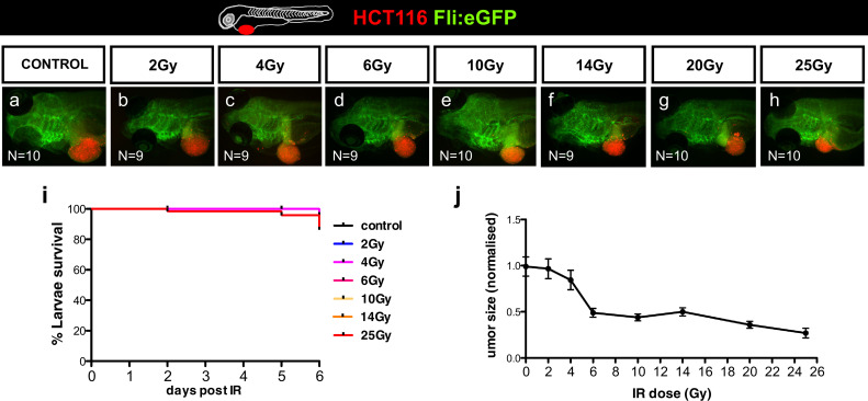 摘要:尽管新辅助放射治疗在直肠癌中的作用已得到充分肯定,但在开始治疗前区分放射耐受性肿瘤和放射敏感性肿瘤的能力仍然是一个未得到满足的关键需求。在这里,我们旨在开发一种体内测试,使用斑马鱼异种移植物直接挑战活癌细胞放射治疗。方法:我们利用结直肠癌细胞系和患者组织切片,在不经过体外传代的情况下,制作了斑马鱼异种移植瘤,并开发了一种单剂量25Gy的快速放射治疗方案。作为对放射治疗的影响,我们分析了增殖,凋亡,肿瘤大小和DNA损伤。结果:通过直接比较仅在KRASG13D等位基因上不同的等基因细胞,我们显示在短短4天之内就可以区分斑马鱼异种移植物中的放射敏感性和放射耐受性肿瘤,甚至在多克隆肿瘤中也是如此。最重要的是,我们使用原发性直肠活检进行了概念验证实验,新辅助放化疗的临床反应与斑马鱼人源性异种移植诱导细胞凋亡相关。关键词:化学放疗 大肠癌 斑马鱼转化 个性化医疗 放射疗法结直肠癌(CRC)是全球第三大常见癌症。为了提供临床前的观察和指导治疗决策,我们对小鼠患者源性异种移植(PDX)作为药物筛选模型进行了研究。但是,这是一个耗时且成本高昂的模型,其中样本植入和治疗所需的时间通常约为2-4个月,这使其不适用于临床决策。体外克隆试验也是一个广泛研究的课题。然而,原代细胞在体外很难生长,而且由于这些细胞受到克隆选择的影响,不再代表最初肿瘤的表型,可能会被过度表达,从而影响对患者预后的准确预测。更重要的是,体外克隆试验需要几周时间才能完成,这与治疗决定的时间框架不相符。斑马鱼幼虫异种移植已经发展成为一种有前途的人体肿瘤研究模型。最近,我们发现,在短短4天内,斑马鱼仔鱼肿瘤异种移植瘤可以再现肿瘤增殖、转移和血管生成潜能等特征。显示了斑马鱼和小鼠异种移植物之间相似的药物反应。我们制作了斑马鱼患者源性异种移植(zPDX),并将化疗反应与患者的实际临床反应进行了比较,结果令人满意。在这里,我们评估了利用斑马鱼异种移植体来区分放射敏感性肿瘤和放射耐受性肿瘤的可能性。为此,我们开发了一种单剂量放射治疗(SDRT,1×25Gy)方案,在4天内评估体内敏感性。这个SDRT协议既省时又经济。此外,我们还将我们的SDRT方案与类似于临床应用的低分割放射治疗(SCRT 5×5Gy)方案进行了比较。我们的结果表明我们的SDRT方案可以很好地代表肿瘤反应。此外,我们通过将放射敏感性细胞与其同源辐射抗性克隆混合而产生多克隆异种移植物,并表明我们可以区分同种异种移植物中的两种表型。通过直接比较等基因细胞,我们还发现KRAS对HCT116结直肠癌细胞的放射治疗敏感。最后,我们使用患者活检进行了概念验证实验,为将来的个性化放射治疗分析奠定了基础。斑马鱼异种移植对电离辐射的剂量-反应曲线:生成一个剂量-反应曲线,以测试生存率和肿瘤对不断增加的电离辐射(IR)剂量的反应。首先,我们测定了在我们的实验条件下,即受精后3天(dpf)照射后的幼虫存活率。我们的结果显示,与未经辐射的对照组相比,幼虫存活率没有显著差异。与之前对斑马鱼的研究一致,我们的结果表明,斑马鱼幼虫在发育的这一阶段(从3dpf到8dpf)对IR具有高度的抗性。接下来,我们使用HCT116CRC放射敏感性细胞系生成了人类CRC异种移植物。在我们之前的研究中,HCT116肿瘤细胞被荧光标记并注射到2dpf斑马鱼幼虫的卵周间隙(PVS)中。在注射后一天(dpi),异种移植物用单剂量0,2,4,6,10,14,20和25Gy照射,5天后,即在6dpi时进行评估。为了研究斑马鱼异种移植模型的体内肿瘤反应动力学,我们分析了辐射对肿瘤大小(每个肿瘤的细胞数)的影响。在2Gy~6Gy范围内,受照异种移植瘤的肿瘤大小曲线与照射剂量基本呈线性关系,6Gy可使肿瘤体积缩小约50%。这一曲线与以前使用同一CRC细胞系HCT1116的研究一致. 在6至14 Gy之间,效果似乎稳定,随后肿瘤缩小约63%(20 Gy)和73%(25 Gy)。 我们的结果与以前的球体研究一致,后者显示出比经典的贴壁2D体外细胞培养更高的存活率。