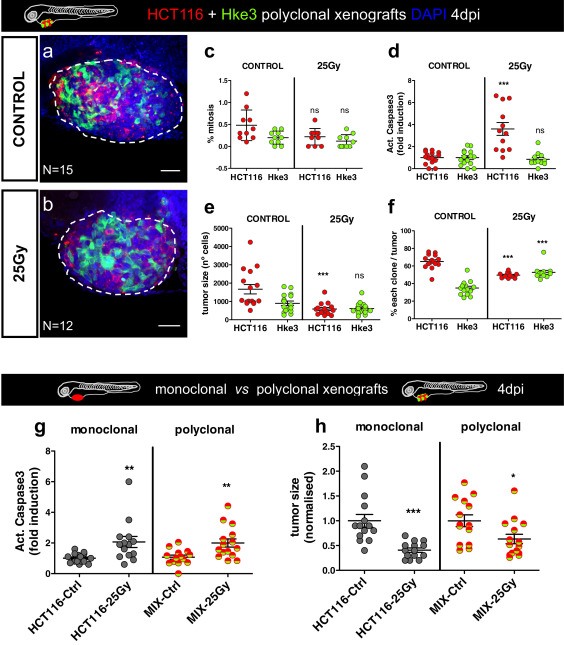 SDRT方案区分敏感肿瘤和耐药肿瘤:我们的目标是开发一种快速的体内方案,以区分放射敏感性和放射耐受性肿瘤。 这将使无反应者免于不必要的毒性,并探索替代治疗策略。 我们选择了大剂量以最大化效果。由于SDRT(1×25Gy)可使HCT116肿瘤在5天后缩小约73%,对异种移植存活率无明显影响,因此我们将试验持续时间缩短至4天,为将来的临床治疗提供了一个实用、快速的方案。先前的研究表明,KRAS可能使肿瘤对放射治疗敏感。 HCT116肿瘤细胞带有KRASG13D突变,与同基因KRASWT Hke3细胞系相比,它们具有很高的增殖能力。由于放射敏感性与增殖高度相关,我们假设具有较低增殖潜能的Hke3可被视为阴性对照。我们制备了HCT116和Hke3异种移植物,在1dpi时,异种移植物接受25gy的单次剂量。在IR后3天,我们评估了辐射对增殖、凋亡和肿瘤大小的影响。正如预期的那样,25Gy的辐射导致HCT116的增殖显著减少,凋亡显著增加,同时肿瘤体积缩小约55%。相比之下,尽管辐射减少了Hke3细胞的增殖,但它既不诱导细胞凋亡,也没有降低肿瘤质量。由于新辅助治疗通常包括放疗和基于5FU的化疗(CRT)的联合治疗,因此我们在我们的模型中,以5FU单独作为对照,测试其对HCT116和Hke3异种移植的影响。如预期的那样,CRT可显著降低HCT116肿瘤的增殖和诱导凋亡,并使肿瘤明显缩小。5FU与放疗联合应用可产生相加效应,明显降低有丝分裂指数,诱导细胞死亡,但不影响肿瘤的缩小。CRT对Hke3细胞凋亡及肿瘤大小无影响。从体内和体外实验来看,电离辐射可能刺激肿瘤的转移过程。临床观察不能直接证实这些数据,留下了放射治疗是否增强转移的问题。利用斑马鱼异种移植模型,我们分析了辐射是否能改变HCT116和Hke3肿瘤异种移植的转移潜能。然而,没有观察到显著的差异。值得注意的是,尽管HCT116和Hke3在放射研究中被广泛应用和接受,但它们是结肠癌细胞系,在直肠癌细胞中可能会发生不同的反应。总体而言,我们的结果表明,斑马鱼异种移植模型具有足够的分辨率,能够在短短4天之内区分出CRC HCT116 / Hke3放射敏感性和放射耐受性细胞。 同样,我们的结果突出了KRAS突变如何使细胞对放射疗法敏感。斑马鱼异种移植物对多克隆异质性肿瘤放射敏感性的分辨力:为了证实HCT116和Hke3克隆放射敏感性的差异,我们在同一宿主中联合注射了两个细胞系,每个细胞系都用不同的亲脂染料标记。通过共注入,我们可以直接比较在相同实验条件下的响应。通过这个实验,我们试图重现结直肠癌肿瘤的一个共同特征:克隆异质性。在1dpi时,混合异种移植物(HCT116+Hke3)暴露于1×25Gy,并与未照射的对照组进行比较。在4dpi时对两个种群分别进行分析。与单克隆瘤相似,HCT116肿瘤在放疗后增殖指数降低,细胞凋亡,每瘤HCT116细胞数减少一半。相比之下,放射对异质性肿瘤团内Hke3细胞的存活率没有影响。有趣的是,在对照的非照射肿瘤中,有趣的是,在非照射的对照肿瘤中,鉴于其较高的增殖能力,HCT116KRASG13D细胞比Hke3KRAS-WT占优势,约占肿瘤的70%。总之,这些结果表明,斑马鱼异种移植物和我们新的SDRT-25 Gy方案在4天内完成,即使在相同的异种移植物中,也可以区分放射敏感性和放射耐受性肿瘤。SDRT与分级放疗方案之间的直接比较:SCRT或长程分割(25-28×1.8Gy)是推荐的新辅助治疗方法,在临床上常规应用于部分LARC癌患者。因此,我们试图将我们的SDRT方案与临床上给出的方案之一,即SCRT-5×5Gy进行比较,因为25-28×1.8Gy不适用于检测。在1dpi条件下,制备了HCT116和Hke3斑马鱼异种移植体,并随机分布在3个实验条件下:对照组(未辐照异种移植体)、SCRT(5×5Gy)和SDRT(1×25Gy)。为了直接比较这两种方案,在所有条件下给予相同的治疗后时间:治疗后3天(3dpT)分析异种移植物,即SDRT为4dpi,SCRT为8dpi。在HCT116放射敏感性肿瘤中,两种方案都减少了细胞有丝分裂的数量。然而,只有SDRT显示了显著的2倍凋亡诱导作用。. 然而,肿瘤大小的量化显示了两种方案的抗肿瘤作用:SDRT导致肿瘤大小减少59%,而SCRT导致肿瘤大小减少80%。因此,我们的结果表明,SDRT方案对肿瘤的增殖和凋亡的影响比SCRT方案强。