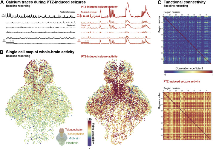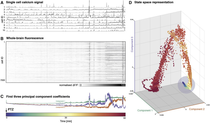 状态转变:癫痫性癫痫发作的一个关键特征是出现了从正常状态到异常状态的转变,这通常与异常的神经元活动以及跨神经元网络的异常同步有关。斑马鱼PTZ诱发癫痫的影像学表现为大脑状态的改变,其特征是神经元同步性的异常水平,遵循一个特征性的时间过程。在所有的研究中,这些向异常状态的转变的特征是长程功能连接的增加,这意味着失去了通常偏向于邻近神经元和区域连接的空间限制。通过检查细胞活动的低维表示中的时变变化,或根据主成分或相关的低维数据投影的时变功能连接性,提供了一种简洁的方法来表示这种全脑状态转换。此类方法表明,PTZ暴露后会进入异常状态空间,提示癫痫发作过渡。尽管这使得计算上识别全脑过渡成为可能,但此类方法本身并不提供过渡的机械解释。