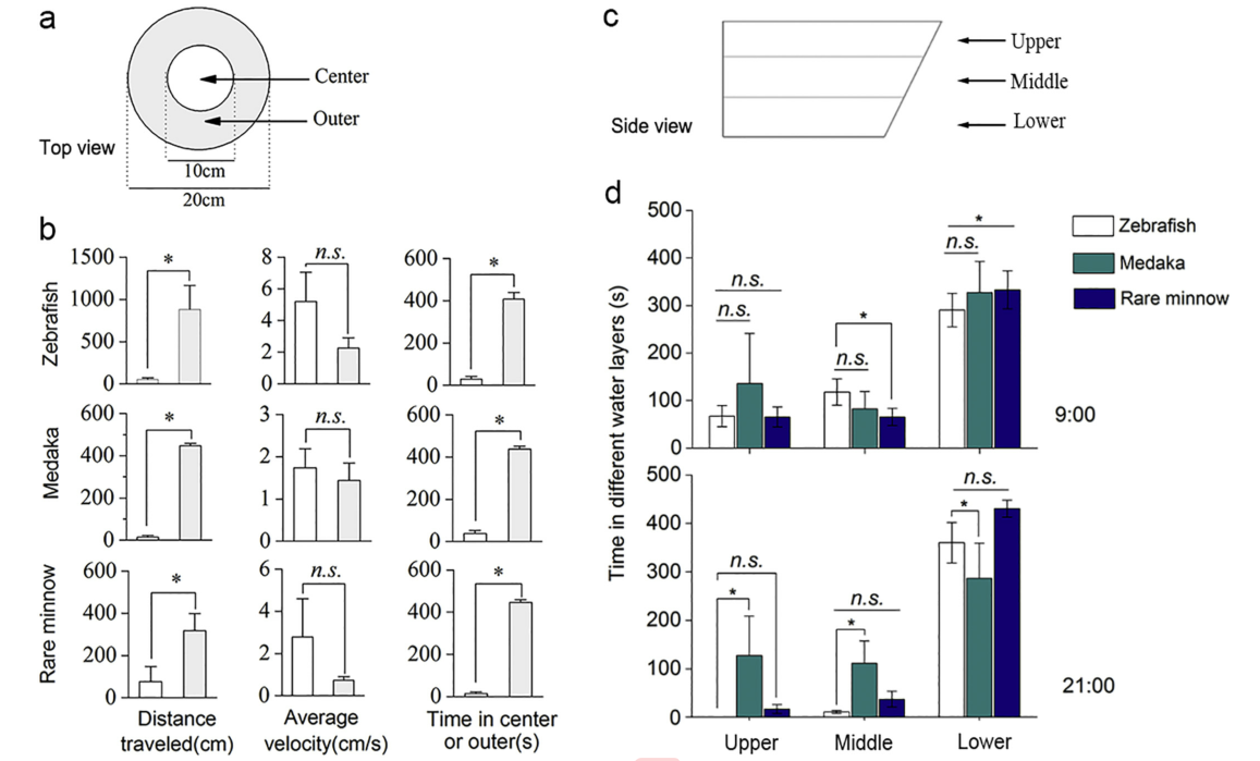 (a)敞开式水槽示意图(顶部)。单个空间实际上被一个内圆分成两个部分。(b)游程(cm),平均速度(cm/s),以及斑马鱼、medaka和中国鲦鱼在open field tank的“中心”和“外围”区域所花费的时间(s)。(c)新型水槽(侧面)示意图。(d)鱼在上午(9:00)和晚上(21:00)在不同区域所花费的时间(%)。