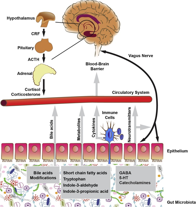 微生物-肠-脑轴描述了位于胃肠道(GI)的微生物与宿主中枢神经系统(CNS)之间的复杂双向通路。该轴监测并整合肠道功能,将大脑中的情感和认知中心与肠道通透性、肠道反射、肠道内分泌信号和免疫激活联系起来。通过迷走神经神经元与肠上皮细胞形成突触来实现双向交流, 通过微生物产物的产生或对宿主细胞因子和趋化因子进行微生物刺激,穿透血脑屏障并对宿主神经系统产生直接影响。宿主下丘脑-垂体-肾上腺轴(HPA)协调对环境化学物质等应激源的适应性反应,升高全身促炎细胞因子,在微生物群-肠-脑轴中也起重要作用。迷走神经通路和HPA通路之间的通讯可以调节肠道效应细胞的活动,例如上皮细胞,平滑肌细胞,间质细胞和肠嗜铬细胞,以及肠神经元,它们也可能受到肠道微生物群的影响。这些细胞对肠道微生物合成和/或代谢的一系列分子有反应,这些分子包括儿茶酚胺,GABA,胆汁酸和短链脂肪酸(SCFA)。一种众所周知的宿主微生物相互作用与神经递质5-羟色胺有关,其中90%以上是通过肠嗜铬细胞中的微生物依赖性合成在肠道中产生的。