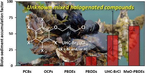 爱媛大学的研究小组使用先进的仪器方法,包括全面的二维气相色谱法/高分辨率飞行时间质谱法(GCxGC / HRToFMS),对广岛湾贻贝和沉积物中采样的已知和未知的POP类物质进行了筛选。 GC /磁性部门HRMS。除了公知的外毛细胞(持久性有机污染物和的HNP),未知混合卤代化合物含有一个氯和三到五溴(UHC -溴3-5Cl)的以C的分子式9ħ6溴3CLO,C9H ^5溴4ClO和C9H5Br4检测到ClO。尽管没有商业化生产,但发现这些未知化合物在海湾沿岸无处不在,这表明在沿海环境中无意(自然)形成。生物群(贻贝)-sediment积累因素UHC-Br与(BSAFs)3-5氯是一个数量级比那些具有相似辛醇-水分配系数更高持久性有机污染物(log Kow值)值,这表明它们的高生物累积性的潜力。因此,有必要对针对各种营养级海洋生物的人为和天然OHC进行全面监测和生态毒理风险评估。
