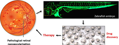 摘要:视网膜的病理性血管生成是失明的主要原因。血管内皮生长因子是视网膜血管疾病的主要血管生成诱导因子,其靶向治疗手段存在明显的局限性。因此,视网膜新生血管的实验模型仍然是研究新的抗血管生成策略并将其带给患者的关键。最近的观察表明,斑马鱼胚胎的眼部新生血管化可能是鉴定血管生成抑制剂的新靶点。这篇综述强调了斑马鱼胚胎作为筛选抗血管生成分子用于治疗血管生成依赖性眼病的创新模型系统。关键词:血管生成 血管生成抑制剂 胚胎发育 血管性视网膜病变 斑马鱼简介:病理性视网膜血管生成是导致儿童和工作年龄人群视力损害并发症的主要原因。新生血管生长在视网膜表面,延伸到玻璃体凝胶和晶状体,失去正常的分支结构。这导致严重的并发症,包括玻璃体出血、牵引性视网膜脱离、黄斑水肿,最终导致视力丧失。促血管生成因子在增生性视网膜病变发病机制中的作用是至关重要的,血管内皮生长因子(VEGF)是研究最多的相关因子。因此,抗VEGF策略可作为经典激光光凝的替代方法。已经研制出三种VEGF阻断剂,第四种药物贝伐单抗用于非标记药物。然而,抗VEGF治疗的局限性确实存在,因为VEGF驱动途径只是调节眼睛血管生成的复杂机制的一部分。事实上,其他因素的产生可能会导致抗VEGF治疗的耐药性,从而限制其疗效。因此,需要针对调节眼血管生成的不同途径识别新的抗血管生成策略的新方法。视网膜血管生成已被广泛研究使用各种小鼠模型,其中可以进行药理学研究。然而,这些模型的应用受到一些限制,并且已经建立了适合大规模筛选小型抗血管生成化合物的体外和离体工具。斑马鱼是研究生理和病理血管生成机制的有效替代动物模型。最近的观察显示,斑马鱼的眼睛新生血管化可能代表了验证血管生成抑制剂的合适平台。这篇综述强调了斑马鱼胚胎作为筛选抗血管生成分子用于治疗血管生成依赖性眼病的创新模型系统。视网膜血管疾病:视网膜和脉络膜新生血管是严重眼病如早产儿视网膜病变(ROP)、糖尿病视网膜病变(DR)、年龄相关性黄斑变性(AMD)和视网膜静脉阻塞(RVO)视力丧失的主要原因。ROP是西方儿童失明的主要原因。ROP发生在早产儿中,是一种双相性疾病,包括血管丢失的初始阶段,接着是血管增生的第二阶段。新生血管在视网膜血管与无血管区的交界处生长,产生涉及视网膜、玻璃体和晶状体的纤维性瘢痕。治疗包括通过冷冻疗法或激光光凝术消融周边无血管视网膜,尽管也可使用抗VEGF药物。然而,激光消融并不完全有效,抗VEGF化合物可能具有损害未成熟视网膜的副作用。DR是糖尿病的主要并发症,也是工作年龄人群视力损害的主要原因。它开始于非增殖性微动脉瘤,发展为增殖性糖尿病视网膜病变(PDR),特征为软性渗出物和硬性渗出物、出血和新血管形成。视网膜微血管网的渐进性损伤导致组织缺血、缺氧诱导因子-1(HIF-1)上调、VEGF分泌的刺激,并最终导致PDR,其诊断依据是存在新生血管或视网膜/玻璃体前出血。DR的特征是血管生成与炎症之间的紧密串联,炎症反应促进新生血管,反之亦然。尽管激光光凝可以长期恢复新生血管,但抗血管生成药物被广泛使用。无论如何,完全解决治疗的识别仍然是富有挑战性的。AMD是导致视功能障碍的多因素进展性黄斑病变,根据渗出物的缺失或存在分为“干”和“湿”两大类。湿性病变更为严重,其特点是脉络膜在黄斑视网膜色素上皮(RPE)后面生长血管。尽管目前还没有治愈AMD的方法,但是光动力疗法和抗VEGF药物可以预防严重的视力丧失并减缓疾病的发展。RVO是继DR之后的第二最常见的视网膜血管疾病,并且由于黄斑水肿和/或视网膜缺血的发展可能导致失明和视力受损。RVO患者接受激光光凝和玻璃体内注射抗炎药治疗,尽管两种方法都不是确定的。事实上,激光治疗只会减少黄斑水肿而不改善视力;与视力方面更好的结果相关的药物治疗增加了眼压以及青光眼和白内障的风险。血管因子作为病理性视网膜血管生成的治疗靶点:VEGF是参与血管生成和血管通透性的主要细胞因子之一。实验和临床证据表明,新生血管疾病视网膜缺血导致其眼内水平升高。此外,VEGF水平与血-视网膜屏障的破坏、血管通透性增加以及新生血管有关。这些观察结果导致了这样的假设,即抗VEGF药物可以阻止甚至逆转血管生成依赖性眼病的进展。尽管抗VEGF干预比替代治疗显示出更好的结果,但抗VEGF治疗的局限性确实存在。由于作用时间短,玻璃体内注射需要相对较高的频率。这可能会导致局部和全身不良反应,如眼部炎症和眼内炎。此外,在很多患者中观察到的不良反应提示,VEGF驱动途径只是调节眼内血管生成的复杂机制的一部分,并且其他因子的产生可能导致对抗VEGF治疗的抵抗并限制其疗效。除VEGF外,多种血管生成和炎性因子的局部生成可能导致病理性视网膜新生血管形成。斑马鱼作为人类疾病研究的模型:斑马鱼在过去几年中已被广泛用于揭示胚胎发育中涉及的生物和分子途径,作为研究人类疾病的替代平台。与其他动物模型相比,斑马鱼具有操作简单、维护成本低、光学透明度高、后代数量多等优点。调控发育中的斑马鱼胚胎基本血管的基因和机制与其他脊椎动物有显著的相似性。在斑马鱼胚胎发育的最初几天,血管树的结构非常简单,因此允许使用高分辨率成像和操纵技术