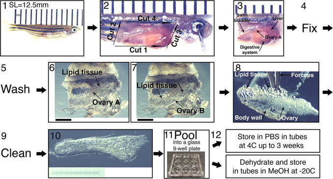 摘要:卵母细胞分化是一个高度动态和复杂的发育过程,其机制理解促进了女性生殖、生育和卵巢癌生物学。尽管斑马鱼模型具有许多特性,但它尚未完全用于研究早期卵母细胞分化和卵巢发育。部分原因是成年斑马鱼卵巢的特性使得获取早期卵母细胞在技术上具有挑战性。为了克服这些技术障碍,我们利用了斑马鱼幼鱼的卵巢,在那里早期卵母细胞可以容易地大量发现并以可预测的方式进展。我们对卵母细胞分化和卵巢发育的早期阶段进行了描述,并确定了准确的分期标准。我们进一步发展了定量显微镜、实时成像技术、卵巢培养和卵母细胞的阶段性分离用于生化分析。这些方法最近为我们提供了关于早期卵子发生的史无前例的观点,使我们能够研究Balbiani体的形成,尽管Bb具有巨大的发展意义,但是它很少被研究,并且它是如何形成的,两个多世纪以来在任何物种中都是未知的。我们能够追踪Balbiani体的形成和卵母细胞对称性断裂到减数分裂的开始。本研究揭示了卵母细胞新的细胞骨架结构,以及特化的细胞组织对分化的贡献。总的来说,幼年斑马鱼卵巢是细胞和发育生物学研究的一个令人兴奋的模型。我们描述了斑马鱼身上开发的卵巢研究的方案,包括所有实验步骤,这些步骤将允许其他斑马鱼重复这种分析。关键词:卵母细胞极性 卵子发生 卵巢发育 斑马鱼 Balbiani体 卵巢培养 免疫荧光 原位杂交 卵母细胞分离简介:虽然早期卵子发生已经在果蝇中被广泛地描述,但是其卵子发生和卵巢发育的模式并不代表脊椎动物,尽管有些方面是保守的。在小鼠中,对卵子发生的一般进展进行了表征,并研究了许多破坏卵子发生的突变基因。斑马鱼尚未完全用于卵子发生的研究,部分原因是缺乏分子和形态学特征以及缺乏足够的分析工具。三维(3D)高分辨率细胞视图是发育过程的形态学和细胞分化特征全面分析的关键。成年斑马鱼卵巢对早期卵母细胞的这种分析提出了挑战,早期卵母细胞非常小。成年斑马鱼卵巢形态学上厚而呈小叶状,含有多期卵母细胞的非同步混合。许多是晚期卵母细胞,非常大(直径为200~730μm),不透明。早期卵母细胞非常小(8~30μm),透明。这为早期卵母细胞的分析提供了技术上的障碍。首先,小而透明的早期卵母细胞在大的不透明卵母细胞中很难识别。其次,成年斑马鱼卵巢的厚度使得获得抗体和生命染料的均匀穿透具有挑战性,这是高分辨率定量成像所必需的。第三,厚的卵巢也降低了共焦显微镜图像采集的质量。因此,斑马鱼早期的卵子发生很少被整个高级显微镜所接近,并且主要通过组织切片的分析来解决,而组织切片缺乏3D信息。由于这些限制,对早期卵子发生过程中卵母细胞发育的描述和机理理解一直缺乏。为了规避这些问题,我们和其他人已经使用幼年卵巢作为早期卵子发生的模型。与成人卵巢相比,幼年卵巢扁平且伸长。它只包含年轻的发育透明的卵母细胞。在给定的青春期卵巢中的卵母细胞一般处于每周进展的类似阶段。这为染色和共聚焦成像技术提供了极好的条件,在共聚焦成像技术中,容易发现大量所需阶段的卵母细胞。我们利用了幼年卵巢的这些特性,建立了定量显微镜和活体延时成像的方法,提供了卵子发生过程的极好视图。我们已经确定了早期卵母细胞的精确分期标准。我们还开发了短期的卵巢培养方案。我们开发了一种分离特定卵母细胞的方法进行生化分析。这个工具箱又可以应用于卵子发生的功能丧失的遗传研究。因此,斑马鱼幼体卵巢作为研究早期脊椎动物卵子发生的模型具有很大的优势。我们描述了受精后4-10周幼年卵巢的发育过程。鱼类设施之间的环境条件不同,例如喂养方式,导致幼鱼生长速度不同。此外,在一致的条件下,在同一水箱中饲养的个体之间的生长可能有所不同。更精确的胚胎后发育的标准化测量被确定为标准长度(SL;从鼻子到尾巴底部的长度以毫米为单位,不包括尾鳍)。我们监测了实验室在4和10 WPF之间饲养的鱼类SL。在4 WPF 72%的鱼中(n=32)SL=8~11 mm,28% SL=6~8毫米。在5—6WPF, 92%的鱼(n=143)SL=10~14 mm,8%在15毫米以上。我们发现,SL=8-10mm的鱼卵巢在减数分裂开始时主要含有生殖系干细胞、卵原细胞和卵母细胞。鱼卵巢SL=10~20mm,早期双线期I期卵母细胞直径≤60μm。这些发现与以前的报告是一致的。因此,可以选择特定SL范围的卵巢来分析感兴趣的卵母细胞阶段。为了确定幼年卵巢的早期卵子发生阶段是否反映了成年卵巢的卵子发生,我们对成年卵巢的早期卵母细胞阶段进行了分析。我们解剖成人卵巢,手动去除所有大的不透明卵母细胞(III和IV期,卵母细胞形成期),并分析含有年轻卵母细胞的卵巢组织块(I和II期)。我们证实,早期卵子发生的主要形态特征,如卵母细胞的阶段和大小、核的形状、染色体凝聚、核仁的数目和位置、Balbiani体形成和一般细胞组织(以下均描述)在幼虫和成虫卵子之间是一致的。除了有利的物理特性外,幼年卵巢还提供更强有力的统计分析。在斑马鱼中,所有鱼类的未成熟性腺最初发育为卵巢。这种性腺具有双潜能,以后或者进一步发展为卵巢,或者转变为睾丸。性别决定的过程决定了性腺的命运,要么继续发展为卵巢,要么转变为睾丸。实验室菌株的性别决定依赖于环境线索,目前尚不完全清楚,但睾丸的转变机制部分已知。在这个过程中,凋亡导致卵母细胞的丢失。当