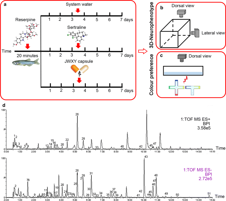 摘要:随着社会压力的增加,人人面临抑郁的高风险。随后,抑郁影响认知行为,并对日常生活产生负面影响。幸运的是,中药加味逍遥胶囊(JWXY)对降低抑郁症和改善认知行为有效。方法:通过超高效液相色谱和四极杆飞行时间质谱分析鉴定了JWXY胶囊的成分。我们用自动3D视频跟踪系统分析了新水箱中抑郁样斑马鱼的行为,并进行了颜色偏好测试,同时检测舍曲林和JWXY胶囊治疗后的生理变化。结果:舍曲林和JWXY胶囊均能减轻利血平所致斑马鱼的运动行为和抑郁表型。JWXY胶囊能显著改善利血平所致的抑制性探索行为。此外,随着抑郁行为的发作,斑马鱼表现出认知行为的改变,如颜色偏好改变。然而,与舍曲林相比,JWXY胶囊更有效地挽救了这种颜色偏好模式的改变。此外,皮质醇水平升高,酪氨酸羟化酶(TH)表达增加,单胺类神经递质降低,包括5-羟色胺(5-HT)和去甲肾上腺素,参与抑郁行为。此外,舍曲林和JWXY胶囊通过改变内源性皮质醇和单胺类神经递质的水平,挽救了斑马鱼的抑郁表型和认知行为。结论:JWXY胶囊比舍曲林更有效地减轻利血平诱发的斑马鱼抑郁症和认知障碍。本研究可为抑郁症的临床治疗及JWXY胶囊的作用机制提供新的见解。关键词:抑郁行为 TCM 色彩偏好 斑马鱼背景:抑郁障碍(MDD)是最常见的脑疾病之一,通常与其他精神障碍并存。抑郁障碍的特征是活动减少、情绪低落、思维和认知功能减慢,从而显著降低生活质量。精神疾病如精神病、抑郁症和其他情绪障碍可能具有多基因和多因素病因。幸运的是,抑郁症的诊断和治疗的改善正在增加。单胺在动物和人脑功能调节中起关键作用。单胺类神经递质,包括5-羟色胺(5-HT)、多巴胺(DA)和去甲肾上腺素(NA),参与调节许多过程,如运动控制、社会行为、认知、睡眠、食欲和焦虑。斑马鱼中,5-HT和DA是研究最多的两种单胺类化合物。5-羟色胺(5-羟色胺,5-HT)既是神经递质又是激素;在高等脊椎动物中,5-HT作用于全身,包括中枢神经系统(CNS)、外周神经系统、心血管系统和内分泌系统;它也参与感觉感知和许多行为。5-羟色胺参与许多行为功能,包括防御组织,及其假定的病理相关,焦虑和应激障碍。新型水箱试验中焦虑样行为与5-HT含量呈正相关。应激水平可以通过全身皮质醇浓度来测量。一些化合物导致帕金森病样行为,因为多巴胺水平降低和运动活性下降。因此,脑内单胺类神经递质的研究对于抑郁症的治疗是必不可少的。对于抑郁症,最广泛使用的治疗方法是抗抑郁药,包括单胺氧化酶抑制剂(MAOIS)、三环类抗抑郁药(TCAS)、5-羟色胺和去甲肾上腺素再摄取抑制剂(SNRIS)和选择性5-羟色胺再摄取抑制剂(SSRIs)。例如,舍曲林是一种SSRI。虽然这些抗抑郁药能有效地缓解抑郁,但也有一些副作用,如头痛、躁动、镇静、呕吐和疲劳。因此,确定一种更好的抗抑郁剂是必要的,这需要研究人员将注意力集中在天然药物,包括中药(TCM)。在治疗抑郁症时,中医从全身层面出发,不仅考虑到患者神经系统紊乱所引起的心理问题,而且还考虑了脏腑、气血的变化。中药加味逍遥胶囊(JWXY)可提供可靠的临床疗效,与西药相当。此外,中医药更便宜,副作用少。在文献中,已经报道了几种测定成年成年斑马鱼行为学改变的方法,如旋转逃避试验、咬合试验、新罐试验、位置偏好试验、T迷宫、迷宫和Y迷宫试验。用于评估动物模型中学习和记忆的工具包括视觉刺激,包括颜色偏好。斑马鱼可以区分颜色和显示自发的方式或回避行为。一些研究支持斑马鱼的基于颜色的学习和记忆范例或涉及厌恶、焦虑或恐惧的实验。斑马鱼偏爱蓝色和绿色,避免黄色和红色。斑马鱼视觉系统包括具有红色、绿色、蓝色和紫外线敏感的锥体视网膜,斑马鱼是昼行性动物,这是发展视觉信号认知反应研究的理想模式。在认知研究中,斑马鱼由于其精细的脑结构、简单性和神经化学作用而越来越受欢迎,并在行为脑研究方面具有优势,这为人类提供了翻译相关性。此外,斑马鱼是一种理想的、有前景的药理、疾病、胚胎学和发育研究的模式生物,因为它与哺乳动物共有许多基因、蛋白产物和分子途径。斑马鱼情绪调节与颜色偏好的关系也有研究。斑马鱼可用于分析与焦虑/抑郁的心理药理学治疗相关的学习和记忆变化。与2D方法相比,3D方法通过使用两个视频提高数据完整性,并有助于减少实验对象的数量。3D方法从顶部和正面视图整合位置信息,这对测量斑马鱼抑郁症样行为是必不可少的。2D方法在阐明鱼类行为的神经行为基础方面也起着举足轻重的作用。利血平通过消耗单胺引起抑郁症,广泛应用于斑马鱼药理作用诱发抑郁症样表型的研究。本研究通过比较三种单胺类神经递质和激素皮质醇的行为和浓度,对舍曲林和JWXY胶囊治疗斑马鱼利血平所致抑郁样行为的疗效进行了对比分析。舍曲林和JWXY胶囊挽救抑郁行为和颜色偏好,伴随着单胺和皮质醇的变化。本研究旨在探讨舍曲林和JWXY胶囊对利血平所致抑郁的斑马鱼行为、认知能力和生化指标的影响。方法:斑马鱼:恒温循环28.5℃,光照(14小时明,10小时黑暗),连续循环水(KCl 0.05 g/L,NaHCO3 0.025 g/L,NaCl 3.5 g/L,CaCl2 0.1 g/L)。每天喂斑马鱼新鲜咸虾两次。行为测试装置和行为参数:行为装置是根据以前的研究设计的。一种由透明有机玻璃组成的新型水箱是一个5 L的长方形箱(23厘米长×15厘米宽×15厘米深),用来评估斑马鱼