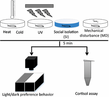 摘要:约100K神经元组成简单透明的脊椎动物斑马鱼幼虫脑,非常适合于解释整个神经电路活动的潜在行为。它们体积小(长4~5毫米)与96孔板兼容,使幼虫斑马鱼适合于高通量的筛选。尽管有这些吸引人的特征,但是斑马鱼幼虫的行为特征与其他的模式生物以及成年斑马鱼相比很缺乏。结果:在这项研究中,我们已经将幼虫斑马鱼的生理和行为反应表征为几种容易适应的刺激,包括热、冷、紫外线、机械干扰(MD)和社会隔离(SI)。这些刺激是基于斑马鱼幼虫对其的厌恶性来选择的。使用一个光明/黑暗的选择范式,其中斑马鱼幼虫显示天生的暗回避行为(即,恐惧症),我们发现,热,冷和紫外线刺激显着提高他们的黑暗回避,热具有最显著的效果,而MD和SI对行为的影响不大。使用皮质醇测定,发现所有的刺激,除热和SI外能显著增加全身皮质醇水平。结论:这些结果确定了一系列可以容易地给予斑马鱼幼虫的应激源。那些引起行为和生理水平差异反应的刺激在电路水平上需要进一步研究以了解潜在机制。抗焦虑剂减轻暗回避,斑马鱼幼虫的光/暗偏好行为同恐惧/焦虑相关。关键词:斑马鱼 幼虫 光暗趋向 焦虑 应激源 行为 皮质醇背景:斑马鱼幼虫期从受精后5天开始,一直持续到数周龄。体积很小,可大量使用,从而使它们适合于高通量的筛选。此外,它们具有典型的脊椎动物解剖学和由100 K神经元组成的简单透明的脑。这一特性使它们在细胞分辨率上完全适合于全脑神经活动成像,这一技术将极大地促进对功能神经回路的理解。从5 DPF开始,斑马鱼幼虫自由生活,寻找食物和逃避捕食者,暗示简单而功能性的处理奖赏和厌恶的神经回路已经形成。. 然而,与成年斑马鱼和其他模型系统相比,我们对斑马鱼幼虫的行为知之甚少。目前尚不清楚幼虫斑马鱼在行为和生理水平上可能对各种应激源的反应。在这项研究中,我们选择了五个容易驯服的感知厌恶性刺激,并在行为和生理层面上表征了它们对斑马鱼幼虫的影响。这些刺激包括热、冷、紫外线、机械干扰(MD)和社会隔离(SI)。在一个有机体的优选温度范围之外,过多的冷热被认为是有压力的。紫外线是潜在的应激源,因为它增加了胚胎和成熟斑马鱼的氧化应激。MD以抑制或追逐的形式和SI在成年斑马鱼中表现出应激反应。施用这些刺激后,用光/暗选择试验评估斑马鱼幼虫的行为反应,并用皮质醇法测定它们的生理反应。我们的研究结果揭示了一个有趣的现象,不同的压力源可能优先引起行为或生理反应。我们的数据还加强了光/暗选择测定对测量斑马鱼幼虫焦虑相关的行为是敏感的。方法:动物:AB野生型鱼杂交,不受干扰。第二天的早晨收集胚胎(年龄设定为受精后第0天, 0 DPF)。分别放入不同的平皿中,每个平皿不超过40个胚胎。这些胚胎从第0天到第2天分别在28°C下生长。在3 DPF,胚胎暴露于正常的昼夜节律。白天的光照强度为350勒克斯。在测试前一天(5 DPF),将4只幼虫从100毫米培养皿中轻轻移走,并转移到35毫升培养皿中,加入7毫升28°C培养液。每组6个35mm的平皿,每皿盛有24只幼虫。每组2个用于行为试验,其余4个用于皮质醇测定。所有的行为测试和皮质醇测定在6 DPF进行。急性应激源:幼虫被带到行为室,并允许习惯环境10分钟。习惯化后,幼虫用各种急性应激剂处理5分钟。对照:对照组不应用应激源。在各皿中加入17毫升28°C培养液。热刺激:将10毫升50°C培养液加入7毫升28°C培养液中,用移液吸管形成17毫升33°C的仔鱼环境。处理时间为5 min,监测水温,5 min内温度从33°C逐渐下降,5 min达到30°C。冷刺激:将10毫升4°C培液液加入含7毫升28°C培养液的皿中,用移液吸管形成17毫升18℃的仔鱼环境。处理时间为5 min,在5分钟内,温度从18℃上升到23°C。紫外(UV)刺激:6个盘子放在白板上置于紫外光下。然后用紫外线(365 nm,1.9-2毫瓦)处理幼虫5分钟。处理前,将10毫升28°C培养液加入移液吸管中,每盘17毫升28℃培养液。机械干扰(MD):将10毫升28°C培养液加入移液吸管中,在各皿中保持17毫升28°C培养液。在每皿中放入一个小搅拌棒,进行搅拌。社会隔离(SI):将一个平皿中的四个幼虫分别分到4个不同 的个体培养皿中,每皿含有17ml培养液。将每皿的周围用蓝色不透明胶带缠绕,确保单个幼虫不会对其他同类有任何视觉接触。处理持续时间5min。行为测试:一个灯箱放在一个桌子上,白炽灯泡放在灯箱的两侧,用漫射光照亮隔间。黑白条纹,5厘米宽,由红外透射丙烯酸制成,然后贴在灯箱的顶部。光侧的光强度为2000 LX,暗边为50 LX。每个轻/暗试验装置由四个单独的方形罐(L4cm×W4cm×H1.5cm)组成。每个罐被分成两个大小相等的隔间,一个是白色的,一个是黑色的。隔墙的四周分别用不透明的白色和黑色胶带包围,以消除墙壁的透明度。我们发现在隔间壁附近的幼虫很难追踪,因此添加了丙烯酸插入物作为间隔物。插入物由红外透射丙烯酸制成,因此在我们的视频中是看不见的。所有丙烯酸类成分采用CalelDRAW设计,并用激光切割机制造。每个槽内装满10毫升28°C培养液(深:5毫米)。在每一轮记录之间,更换水箱中的水。光/暗选择试验:在光/暗选择试验中,以前发现斑马鱼幼虫更喜欢光(或避暗),这种行为被认为是焦虑相关的。因此,在斑马鱼幼虫中光照时间增加的百分比被认为反映了焦虑的增加。5分钟应激处理后,仔鱼从托盘转移到每个容器的中心。药物治疗:幼虫如上文所述