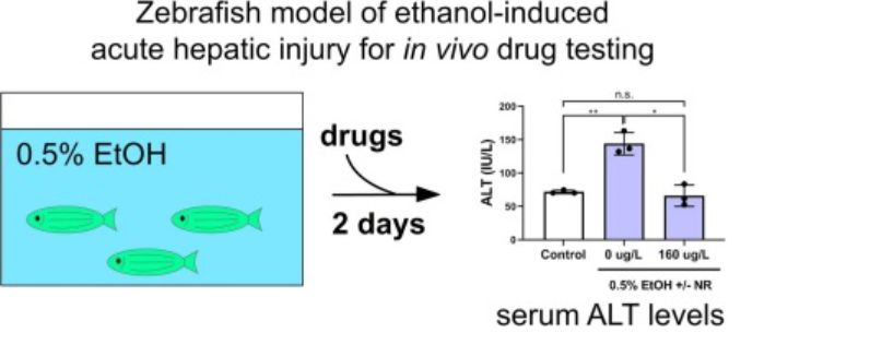 摘要:慢性酒精滥用是常见的,也是导致酒精性肝病(ALD)的主要原因。然而,仍难找到一种安全有效地治疗ALD的方法。在这项研究中,我们评估了成年斑马鱼作为体内模型在快速评估酒精性急性肝损伤药物疗效方面的效用。我们将成年斑马鱼暴露于0.5%乙醇中24、48和72小时,并测定血清丙氨酸转氨酶(ALT)活性。与未经处理的对照组相比,乙醇处理48小时和72小时后,导致ALT水平显著升高。同时,在乙醇暴露期间,肝脏中与炎症相关基因的mRNA表达显著增加。为了评估我们的斑马鱼模型对酒精性急性肝损伤药物试验的有效性,,先前在酒精性肝病的啮齿类动物模型,我们研究了烟酰胺核糖苷(NAD+底物)和TES-1025(α-氨基-β-羧粘酸-ε-半醛脱羧酶(ACMSD)抑制剂,可增加NAD+)的保护作用。我们发现,在暴露于乙醇48小时后,烟酰胺核糖苷和TES-1025处理均可抑制乙醇诱导的血清ALT水平。以类似的方式,核黄素的补充还抑制了乙醇暴露期间乙醇诱导的血清ALT升高。另外,烟酰胺核糖苷和核黄素的补充都抑制了与炎症和新生脂肪形成有关的基因的mRNA表达的上调。综上所述,我们建立了一个成年斑马鱼乙醇诱导的急性肝损伤模型,这将有助于体内药物筛选,这可能在未来提供新的治疗方法来减轻与过度饮酒相关的肝损伤。