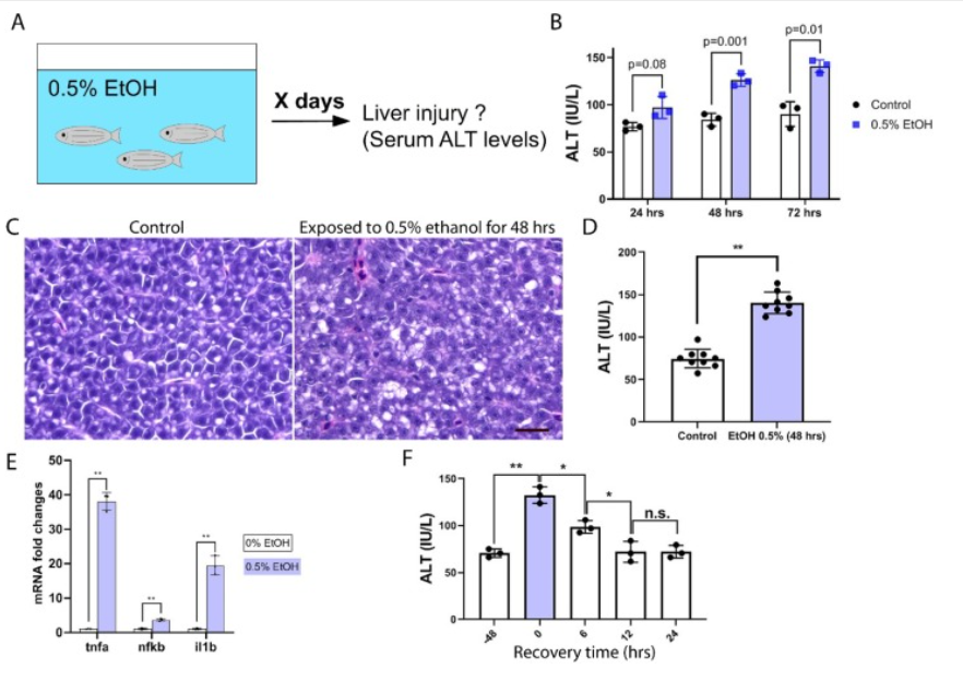 斑马鱼乙醇性肝损伤的快速恢复:由于斑马鱼在各种组织损伤后均显示出快速的再生能力,因此我们试图研究去除乙醇后血清ALT水平的变化。在本实验中,将乙醇处理过的斑马鱼转移到一个装有淡水的水箱中,并在乙醇暴露后6、12和24小时测定血清ALT水平。我们发现乙醇诱导的ALT升高在12小时内降至正常水平。