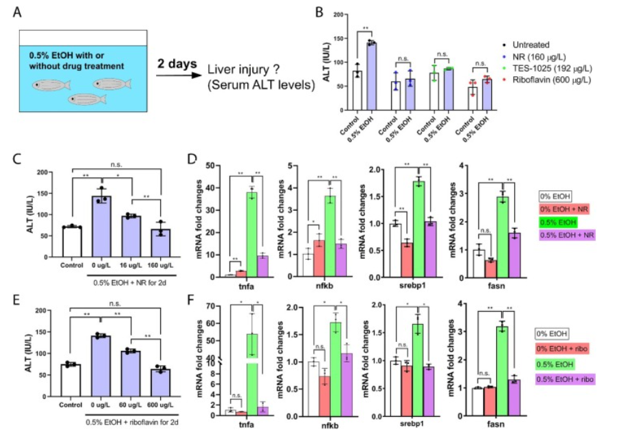 图2、乙醇暴露期间补充烟酰胺核苷、TES-1025和核黄素可抑制乙醇引起的急性肝损伤。(A) 药物检测示意图。(B) 对照组(白条)和乙醇暴露组(蓝条)服用或不服用药物后血清ALT的变化。(C)(C)在乙醇暴露期间通过补充NR来剂量依赖性抑制ALT。(D) 对照组和乙醇暴露斑马鱼肝脏中与炎症和脂肪生成相关的mRNA表达。(E)乙醇暴露期间补充核黄素可剂量依赖性抑制ALT。(F)有或没有核黄素的 对照组和乙醇暴露斑马鱼肝脏中与炎症和脂肪生成相关的mRNA表达。