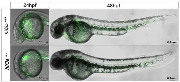 中国科学院水生生物研究所鱼类低氧生物学学科组博士蔡孝廉等,在进行鱼类低氧耐受与敏感的比较研究中,发现鱼类hif-3α可能与鱼类应对低氧胁迫密切相关。研究人员利用CRISPR/Cas9技术,在斑马鱼中敲除hif-3α基因。在实验室正常养殖条件下,hif-3α缺失斑马鱼的发育、生长和繁殖,与野生型斑马鱼相比,无显着差异。然而,hif-3α缺失斑马鱼胚胎的红细胞数量显着减少。鉴于红细胞在机体内具有运载氧的特殊功能,科研人员对hif-3α缺失斑马鱼与野生斑马鱼的低氧耐受能力进行系统的比较分析。研究发现,无论是胚胎还是成体,hif-3α缺失斑马鱼的低氧耐受能力降低;hif-3α缺失斑马鱼的红细胞发育迟缓,大部分阻滞在初始状态,成熟红细胞数量少。