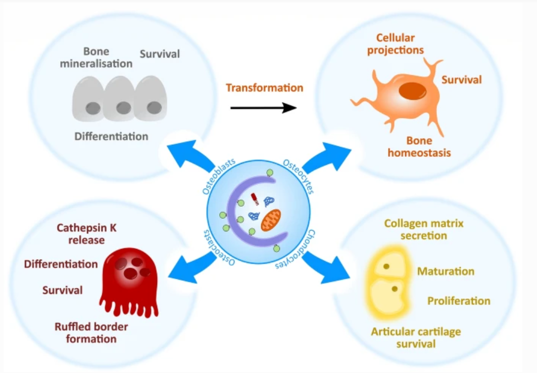 自噬与骨骼发育:多项研究表明自噬与骨骼系统的发育和维持有关。从发育的早期开始,自噬在关键骨骼细胞的分化,转化和功能活性中起着至关重要的作用,这些骨骼细胞包括成骨细胞(骨骼分泌细胞),破骨细胞(骨骼吸收细胞),骨细胞(骨骼维持细胞)和软骨细胞( 软骨分泌细胞)。发育后的新证据表明,这些细胞一旦最终分化,就需要组成型水平的基础自噬,以确保它们所处的低氧,营养缺乏和高渗环境中的正常功能和存活。