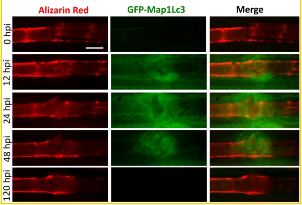 使用GFP-Map1Lc3转基因斑马鱼品系研究自噬在鳍断裂修复和骨再生中的作用–顶部,示意图描绘了如何在斑马鱼中进行骨折修复和再生测定,以及如何使用茜素红在成年斑马鱼中进行活体骨染色。底部,受精后6个月在转基因CMV:EGFP-map1lc3b斑马鱼中进行的骨折修复测定的荧光立体显微镜图像用茜素红(红色)进行活体染色。