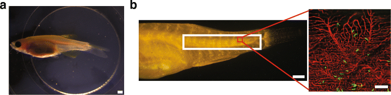 摘要:转移是一个重要的临床问题,其生物学尚未完全了解。活体成像是一种强大的技术,已经显示出极大的承诺,增加我们对事物发展的理解。迄今为止,大多数活体成像研究已经在小鼠中进行,其限制了它的采用。斑马鱼也是一种常用的活体转移显像系统。由于胚胎成像技术简单,使用成人斑马鱼研究转移的研究相对较少。随着时间的推移,没有人跟随转移细胞中的单个细胞。本研究的目的是证明成人斑马鱼模型,能随着时间的推移,以单细胞分辨率进行转移灶的活体成像。方法:使用静脉注射方案将ZMEL1斑马鱼黑色素瘤细胞注射到6至10周龄的Casper鱼体内。因为Casper鱼是透明的,即使是成年人,它们也可以在没有手术干预的情况下成像。2周时间随访单个细胞伴随其被捕获,外渗,形成宏观转移。结果:我们的注射方法可靠地将细胞送入循环,并导致在多个器官中形成肿瘤。用共聚焦显微镜可以在2周内以高分辨率成像皮肤和真皮肌肉中的细胞。捕获被可视化,并确定主要是由于大小限制。逮捕后,外渗发生在注射后1天和6天之间。一旦在血管外,观察到细胞迁移以及形成突起。结论:Casper鱼是一个有用的模型,研究瘤的转移使用活体成像。关键词:斑马鱼 转移性 活体显像背景:转移是绝大多数癌症相关死亡的原因,但我们对潜在生物学的理解仍然不完整。在转移部位发生的事件(即捕获、外渗和生长成新的肿瘤)尤其难以理解。这些事件需要进一步阐明,因为它们可能是转移级联中的限速步骤,这一事实证明肿瘤可以每天将成千上万个细胞流到循环中,但只有很小的一部分会形成转移。肿瘤细胞、血小板、白细胞和内皮细胞之间的动态相互作用是调节转移形成的关键。虽然成像窗口允许研究活体小鼠的转移位点,但一些关键限制限制了它们的广泛应用。首先,实验中的每只动物都需要手术植入成像窗。准备每只动物所需的时间限制了实验中使用的数量。第二,熟练掌握手术技术所需的设备、专业知识和时间使得活体成像远不及常规技术。某些组织在成像窗口的安装之外还存在进一步的技术挑战。例如,肺是小鼠中研究得最好的转移部位之一。然而,肺成像需要额外的稳定技术来补偿呼吸运动,从而减少成像的持续时间。这些技术可以包括离体肺隔离或将肺粘附到成像窗体内以最小化其运动。与这些技术相关的额外挑战限制了小鼠肺部活体成像研究的数量。斑马鱼胚胎由于其光学透明性和在母体外的发育,已被广泛用作活体内转移显像的模型系统。此外,斑马鱼与人类有很大的同源性,约70%的人类基因在斑马鱼中具有可识别的同源性。最近发展的透明斑马鱼,Casper,为肿瘤和转移的活体显像提供成人模型。Casper鱼类携带两个纯合子突变,防止黑色素细胞和虹膜细胞的发育。没有这两种类型的色素细胞,斑马鱼即使是成人也透明,消除了实验之前对动物的任何进一步操纵的需要。Casper鱼类已被用来克隆克隆异质性和新生血管移植原发肿瘤。Casper鱼也被用作定量系统研究转移的荧光作为读出。此外,在肿瘤移植后的Casper鱼中也检测到了微转移。我们在这里描述了一种将肿瘤细胞静脉注射到年轻的Casper鱼中,这是目前用于成年动物注射方法的改进。然后,我们描述一个简单的协议,活体成像,并展示其效用通过表征在两个星期的过程中肿瘤细胞在转移部位的行为。方法:斑马鱼养殖:斑马鱼饲养在28°C,14小时光照,10小时黑暗循环,每天喂三次盐水虾。实验中,用斑马鱼肿瘤细胞注射的鱼单独放置在含有大约400ml水族馆补充水(AMW)的塑料杯中,并每天喂盐水虾一次。注射人肿瘤细胞的斑马鱼在玻璃瓶中以100mL的AMW保存在34℃水中,每天喂食一次。在实验之前,斑马鱼每天通过将水温提高1°C来适应温度升高。用于实验的年轻成年斑马鱼在6和10周龄之间,以每3 L罐的15条鱼的密度被容纳。在注射ZMEL1斑马鱼黑色素瘤细胞之前,明显小于鱼缸中大多数鱼的鱼没有注射。用GC 40Eγ辐照器,在注射前一天和两天,用两剂15Gy照射免疫活性Casper鱼。在注射人肿瘤细胞之前,在注射前1天和2天用15Gy或20Gy照射斑马鱼,或在注射前2天开始使用15μg/ml地塞米松。实验过程中胚胎保持在34度,涉及人类细胞。注射前16h在含80个胚胎的平皿中添加12ul的30 mg/ml链霉蛋白酶。组织学:用0.1%丁卡因在冰上浸泡斑马鱼20分钟,使其安乐死。固定后,鱼在水中浸泡3小时,在Richard Allan脱钙溶液中浸泡16小时,脱钙。然后用水冲洗,乙醇脱水,石蜡包埋,切成5μm厚的切片。切片HE染色。静脉、后眶、胚胎注射:用胰蛋白酶消化ZMEL1斑马鱼黑色素瘤细胞细胞,用4ml含血清培养基对胰蛋白酶进行淬灭。用PBS洗涤细胞2次,静脉注射5×105细胞/μL的无菌PBS或眼眶1×104细胞/1000μL的无菌PBS,胚胎(胚胎)4×104细胞/μL的无菌PBS.。如前所述,将1μL的细胞悬浮液逆向注入到每条鱼中。在静脉注射前,年轻的成年斑马鱼用0.017%三卡因麻醉,直到触觉迟钝。一旦麻醉,鱼被转移到一个干燥的10厘米平皿中注射。注射后,鱼被转移到AMW恢复。共焦活体成像:在AMW中加入50 ppm丁香酚诱导麻醉。一旦鳃盖运动减慢,鱼被放置在一个6孔培养皿的一个孔中,使得后部位于孔的中心,头部靠在周围的塑料上。然后将鱼的后部加入2%的低熔点琼脂糖固定。少量的15 ppm丁香酚在AMW中滴加至鳃,以允许呼吸,而琼脂糖固化。琼脂糖固化后,在AMW中填充15 ppm丁香酚。每分钟监测鱼的鳃