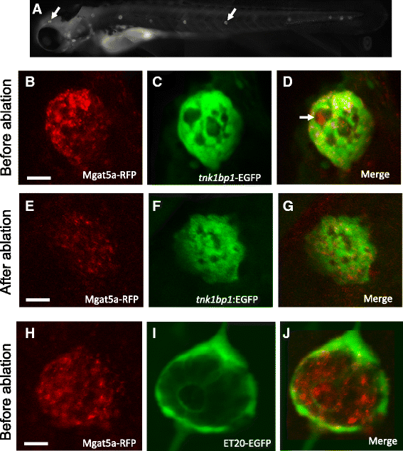 摘要:我们正在使用遗传学来识别特异性地参与听觉再生的基因。在大规模的遗传筛选中,我们鉴定了N-糖基化生物合成途径中的一个基因Mgat5a,其活性对毛细胞再生有负面影响。方法:我们使用斑马鱼突变体分析和毛发细胞再生试验相结合的方法来鉴定斑马鱼中Mgat5a活性的丧失。使用药物抑制N-糖基化,还使用过表达分析的mRNA注射,以证明N-糖基化的变化如何改变细胞信号转导。结果:发现Mgat5a在斑马鱼胚胎发育过程中在多个组织中表达,特别是富集在神经组织中,包括脑、视网膜和侧线神经母细胞。Mgat5a插入突变和CRISPR/CAS9生成的截短突变均导致毛细胞再生的增强,这可能是通过天鹅星碱的药理抑制而引起的。除毛细胞再生外,N-糖基化途径的抑制也增强了侧线轴突和尾鳍的再生。进一步的分析表明,N-糖基化改变了TGF-β信号的反应性。结论:本研究结果为N-糖基化在组织再生和细胞信号转导中的参与提供了实验依据。关键词:斑马鱼 CRISPR /Cas9 Mgat5a N-糖基化 再生背景:Glycans与核酸、蛋白质和脂类一起构成细胞的四个主要组分。聚糖具有很大的结构复杂性,并且在不同的细胞类型中有很大的多样性,从而提供具有不同功能特性的细胞。由于在不同糖形式的检测和表征方面的技术挑战,聚糖研究通常落后于基因组和蛋白质组学方法。糖基化改变的生物学后果仍然是生物医学研究的一个关键但具有挑战性的领域。糖基化蛋白是细胞中聚糖结合物的一种重要形式。聚糖可在多种蛋白质上发现,从分泌的胞外蛋白到膜受体,到胞浆蛋白。糖基化在这些蛋白质上提供了调节细胞内信号和细胞间通讯的潜力。有两种主要的蛋白质糖基化方式,N-糖基化加糖在天冬酰胺的氮上。O-糖基化加糖到丝氨酸或苏氨酸残基氧上。很明显,一个单一的蛋白质可以通过一个或多个糖基化形式在多个残基上糖基化。创伤性损伤后的组织再生是一个复杂的分子信号和细胞-细胞相互作用的过程。由于哺乳动物具有相对有限的再生潜力,许多非哺乳类脊椎动物模型,包括斑马鱼,已经被用来研究组织再生的分子机制,如心脏、肝脏和毛细胞(听力)。研究已经证明了大量的蛋白质和相关的信号通路在组织再生过程中的重要参与,然而,在这一过程中蛋白质糖基化的贡献仍在研究中。在斑马鱼毛细胞再生相关基因的遗传筛选中,我们鉴定了Mgat5a作为再生反应的调节剂。MGAT5A基因在所有脊椎动物中高度保守。它编码β1,6- N-乙酰氨基葡萄糖转移酶V酶,在N-糖基化途径中的内侧高尔基酶催化B1,6GLCNAC-分支N-糖基化合成到各种蛋白质缀合物。以前的报道表明Mgat5a在肿瘤转移、细胞增殖和免疫细胞活化中起着重要作用。本研究对Mgat5a转录因子在胚胎发育过程中的时空分布进行了研究,探讨了Mgat5a和N-糖基化途径在损伤诱导组织再生中的作用。结果:Mgat5a- RFP插入突变促进毛细胞再生:为了鉴定涉及听觉再生的关键基因和途径,我们进行了大规模的靶向诱变和遗传筛选,以确定斑马鱼侧线毛细胞再生所必需的基因。我们对成年斑马鱼的感觉上皮进行了转录谱分析,结果表明:使用聚集的间隔间隔短回文重复序列(CRISPR)相关蛋白9(CAS9)来靶向基因或DNA整合,然后对纯合子进行近交检验,将毛细胞暴露于硫酸铜 1小时后检测再生。染毒后48小时计数毛细胞。在分析Mgat5a MN0157GT突变的基础上,确定了Mgat5a作为再生反应的调节因子。Mgat5a MN0157GT通过插入Mgat5a基因内含子10中的基因诱捕转座子而产生,并在N端产生具有截短Mgat5a蛋白和C末端的红色荧光蛋白(RFP)的融合蛋白。逆转录聚合酶链反应(RT-PCR)分析两个引物构建的基因陷阱整合区显示,突变株Mgat5a野生型mRNA显著减少,但残留表达,表明Mgat5a MN0157GT是一个亚型等位基因。Mgat5a基因MN0157GT突变对毛细胞发育无影响。时间进程分析表明,突变体的毛细胞再生在消融后2天(DPA)得到增强,但与3 DPA的对照相比,表明它不是"过度生长"表型。在Mgat5a MN0157GT突变体中没有观察到额外的表型。Mgat5a在神经母细胞毛细胞和支持细胞中表达,而不是在外套膜细胞中表达:通过可视化Mgat5a MN0157GT突变体中的RFP,我们研究了Mgat5a在斑马鱼胚胎中的定位。显微镜检查显示,RFP存在于斑马鱼的前侧和外侧线神经母细胞,斑马鱼的另一种毛细胞。共聚焦分析表明,Mgat5a RFP融合蛋白在整个颗粒细胞中以一定颗粒形式表达。粒化分布与野生型Mgat5a蛋白的高尔基体定位一致。为了鉴定神经母细胞表达Mgat5a的细胞类型,我们首先用ET(TNK1BP1:EGFP)越过Mgat5a MN0157GT线。其中TNK1BP1启动子在支持细胞中特异性表达绿色荧光蛋白(GFP)。双转基因胚胎在神经嵴的某些区域显示颗粒状共定位荧光,表明支持细胞中GFP和RFP的表达。双转基因胚胎在一些GFP排除区也显示颗粒RFP,表明Mgat5a在毛细胞中的表达。有趣的是,大多数RFP表达通常不直接与GFP共定位,即使在相同的细胞中表达。我们相信,这是因为Mgat5a酶被隔离在高尔基体中,GFP表达是在细胞质的。为了进一步验证Mgat5a在毛细胞中的存在,我们用耳毒性化学铜消融毛细胞,然后检测GFP和RFP的表达水平。铜暴露后,所有细胞均表达GFP和RFP,表明GFP阴性、RFP阳性细胞为毛细胞。发现所获得的双转基因胚胎将RFP和GFP蛋白分配到不同的神经支配区域,Mgat5a RFP在神经轴突(支持细胞)的内环和ET20:EGFP主要位于神经肥大细胞(外套膜细胞)的周围,并且没有显著的重叠。这种分布模式表明Mgat5a不在地