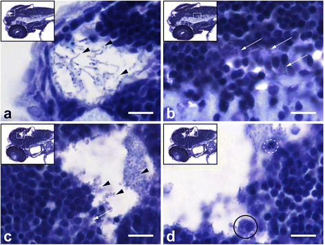 全身性感染:加大剂量尾静脉注射肺炎球菌导致剂量依赖性感染。100CFU /胚胎,300 CFU /胚胎和600 CFU /胚胎的平均存活率分别为0。相比于后脑脑室注射,尾静脉注射能更快速的导致疾病发展。在整个斑马鱼体内和中枢神经系统都观察到细菌浸润。组织学分析表明,细菌早在12 HPI出现在脑实质。斑马鱼胚胎中肺炎球菌性脑膜炎最初的先天免疫反应主要由中性粒细胞组成。