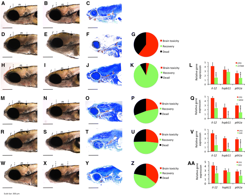 不同组织急性重症OP中毒的救治:确定对头部形态的改变的保护是否确实预示了在细胞和分子水平上的神经保护作用。约45%的幼虫暴露于1×LC50 CPO 24小时抗严重急性OP中毒。因此,很难确定在药物治疗后具有正常形态的幼虫是否是真正地被"拯救"或仅仅具有一种"抗性"。为了克服这种干扰因素,对每个幼虫的头部形态进行分析:(1)即3小时CPO暴露后治疗(2)在治疗结束。解磷定,美金刚,美芬和地塞米松,对暴露3h的急性重症OP模型表现出明显的保护作用。在暴露3小时后,选择头部形态中等变化的幼虫作为解毒剂治疗对象。当幼虫暴露于CPO额外21小时后,约40%死亡,其余60%显示头部形态改变的严重程度增加。同一幼虫脑组织病理学评价显示广泛的液化性坏死。转录分析表明钙代谢相关基因的表达上调(hspb11,pth1a)和炎症反应(IL-12)。解磷定有非常有效的神经保护作用。用这种药物治疗后,87.7%的幼虫恢复正常的头部形态。此外,未观察到严重急性中毒在组织学水平上的病变特征。解磷定也恢复了部分pth1a和IL-12水平。美金刚也抵消了CPO在约47%的幼虫头部的大体形态的影响,组织病理学评估显示,一般情况下液化性坏死。地塞米松防止约42%幼虫的液化性坏死,但地塞米松仅在三个选定基因中的两个引起显著的恢复。