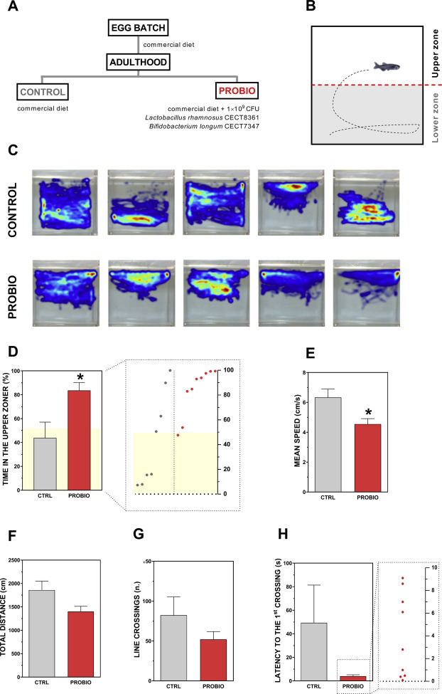 摄入鼠李糖乳杆菌CECT8361和长双歧杆菌CECT73474个月后可调节斑马鱼的行为。 (A)实验设计的示意图。(B) 新型水箱试验(NTT)示意图和确定的分析区域。(C)对两个实验组(对照组和益生菌组)的轨迹进行Ethovision分析后获得的热图。(D) 动物在上部区域所花费的时间(%);(E)平均速度(cm/s);(F)总距离(cm);(G)穿梭次数(n.)(H)穿越到上部区域的延迟。