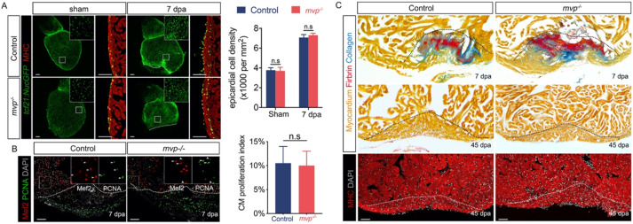 图3. mvp KO鱼的心脏再生。 (A)对照和mvp-/-鱼中心外膜细胞的可视化。(B)对照和mvp-/-动物在心室切除后第7天(dpa)心肌细胞增殖,通过Mef2和PCNA染色进行评估。C) 指定时间点的心室切片图像,评估心肌(MHC)的恢复和疤痕组织(纤维蛋白,胶原蛋白)的消除。