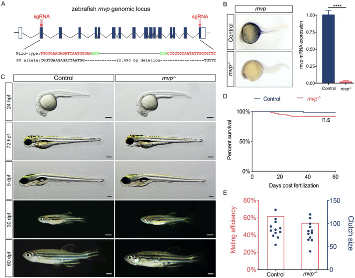 图2. 构建mvp敲除斑马鱼品系。 (A)斑马鱼mvp基因组位点和Cas9 / sgRNA靶向位点。Δ22,490等位基因中的缺失显示为破折号。 (B)原位杂交和qPCR结果显示在mvp敲除胚胎中不存在mvp mRNA。C)在指定时间点的对照和mvp-/-斑马鱼的实时图像。(D)来自三个独立实验之一的mvp-/-鱼和同伴的代表性Kaplan-Meier图。(E)对照和mvp-/-斑马鱼的繁殖力和交配效率。