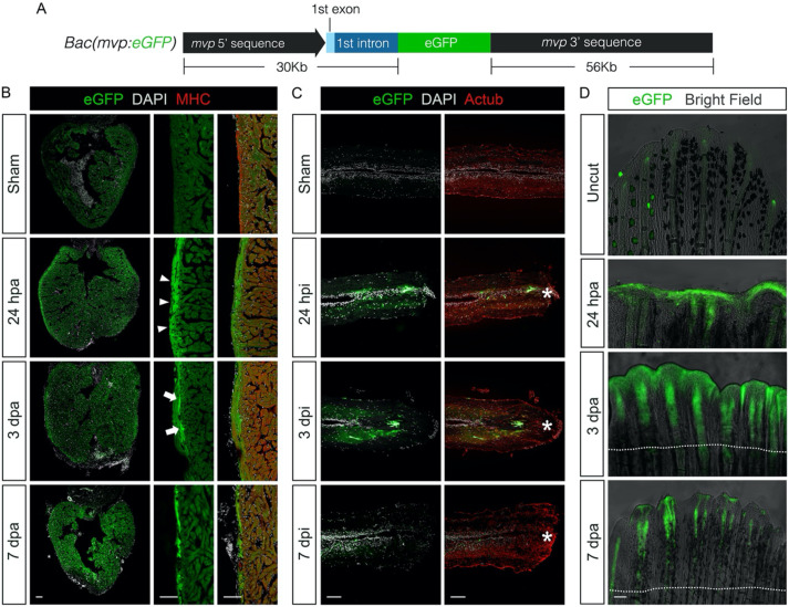 图1.斑马鱼器官再生过程中mvp的表达分析。 (A) mvp报告株转基因结构示意图。 (B–D)mvp:EGFP在指定时间点在心脏,脊髓和鳍中的表达。 B中上面箭头表示心室壁致密层有表达。下面箭头表示心肌原始层的表达。. C中的星号表示受伤部位。