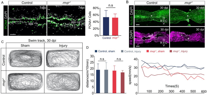 图4. mvp KO鱼中的脊髓再生。 (A)损伤后第7天(dpi),对照组和mvp-/-动物中神经细胞的增殖,通过PCNA染色评估。