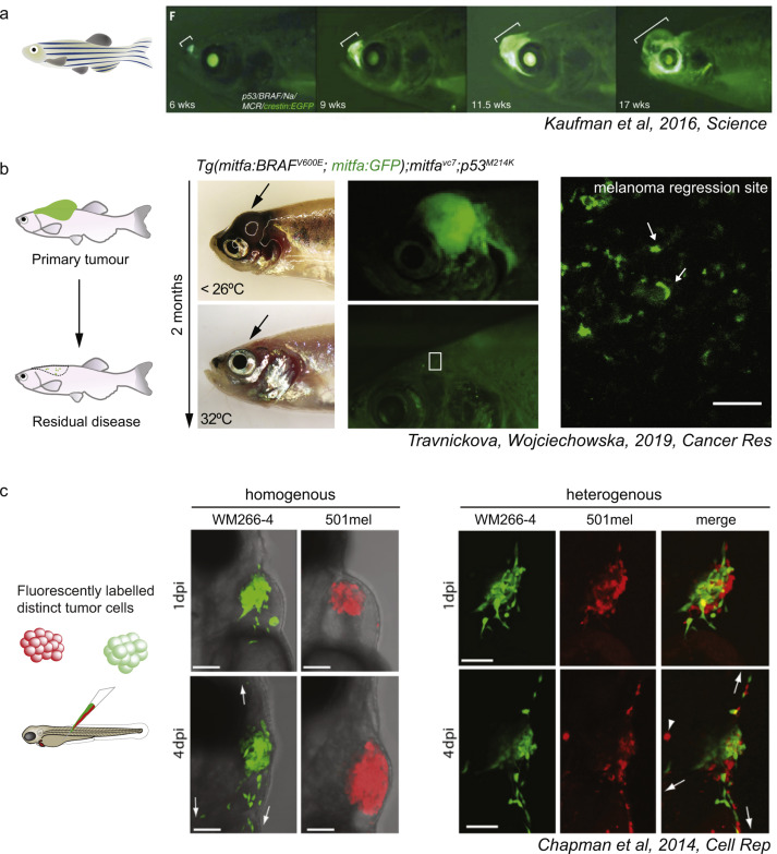 图2、斑马鱼黑色素瘤细胞状态的成像实例。(a) 斑马鱼黑色素瘤的捕获。表达神经嵴转基因crestin:EGFP的黑色素瘤易感斑马鱼能随着时间的推移追踪黑色素瘤的发生和肿瘤的生长。b) 可视化最小残留病(MRD)。斑马鱼原发性黑色素瘤和MRD的亮场和荧光图像。(c) 细胞状态间的表型合作。斑马鱼胚胎移植后两种荧光黑色素瘤细胞系的同种异种移植。异种异体移植物显示协同迁移。