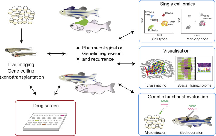 图1.斑马鱼工具来解锁黑色素瘤细胞状态。斑马鱼是解决黑色素瘤异质性和可塑性的有力模型。并行研究发育谱系(左)和黑色素瘤的起始和残留疾病模型(右),可以在复杂的微环境中同时筛选黑色素瘤并进行详细的单细胞和功能分析。介绍了评估黑素瘤细胞状态,可塑性和微环境因素各个方面的各种技术示例。