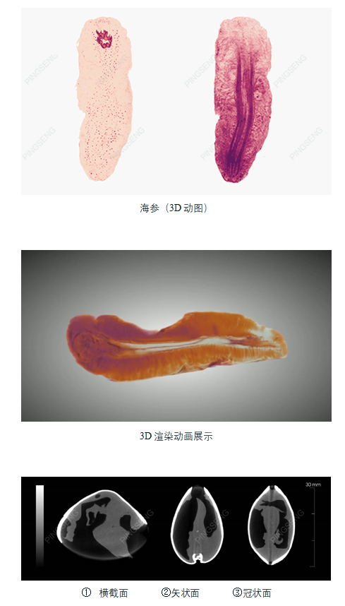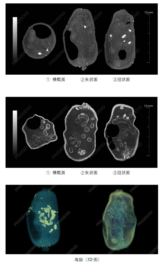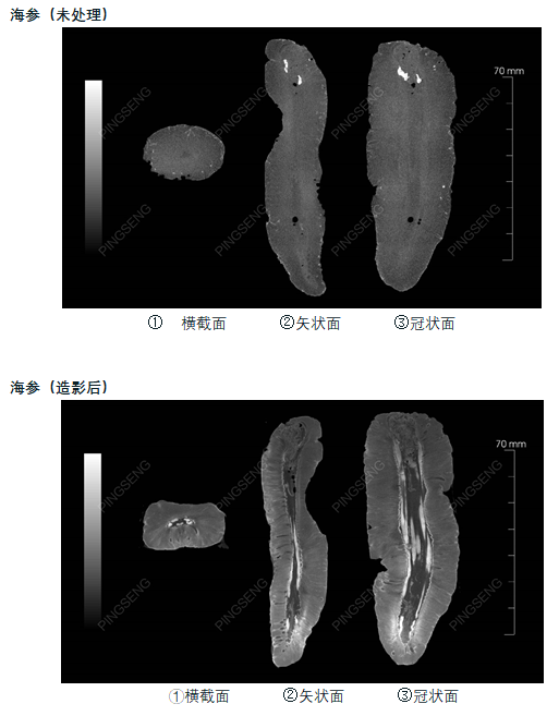 本文介绍的案例海参、海肠和蛤蜊这类无脊椎海洋生物。可以从以下的对比图片中看出在造影处理后的样品内部结构更加清晰,对比度更强。