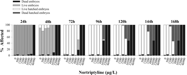 图1、在168h暴露期间,去甲替林(NTP)对斑马鱼生命早期阶段的影响概述。 死亡,活的和孵化生物的比例用不同的彩色条表示。