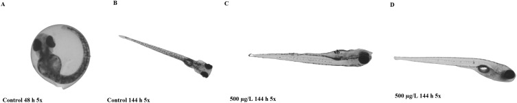 结果:鱼胚胎毒性试验:图1显示了暴露于7种NTP浓度(500至-46,900 µg / L)168小时后斑马鱼胚胎/幼虫死亡率的累积百分比。暴露48 h后,两个最高NTP浓度(22,000和46,900 µg / L)对胚胎完全致死。 所有浓度的胚胎都在孵化前死亡。对于2300、4800和10,300 µg / L NTP浓度,死亡率是渐进的,并随着暴露时间的增加而增加。在4800 µg / L NTP下,几乎所有的胚胎在72 h后都会孵化,但是在144 h后没有生物存活。同样,对于10,300 µg / L NTP,孵化率在72 h后为〜50%,但是在暴露120 h后死亡率达到100%。另一方面,较低的NTP浓度(500和1100 µg / L)与对照组的曲线相似,在168小时后死亡率极低。正如预期的那样,LC50(导致50%死亡率的暴露浓度)表明,随着暴露时间的增加,胚胎/幼虫对NTP变得更加敏感;因此,我们观察到168h后的最低LC50(2190µg/L)。与对照组相比,NTP组在孵化和发育过程中的变化(如尾部形成、卵黄囊吸收、脊柱畸形等)无显著性差异。图2A和B分别显示正常胚胎和幼虫,没有明显的形态畸形。唯一值得注意的亚致死参数是缺乏平衡(图2C,D和图3)。 缺乏平衡的幼虫表现为未充气(图2C)和充气的鱼鳔(图2D)。
